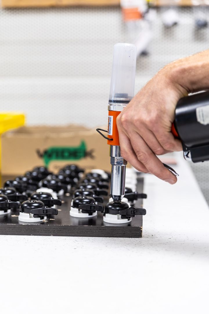 Mathijs schrikt: “Joh, ik heb je nog helemaal geen koffie aangeboden.” Dat wordt meteen geregeld. “We zijn hier bij de assemblage”, zegt de oud-fietsjournalist als we door de riante bedrijfsruimte lopen. “De mensen hier monteren onze houdertjes en bellen. Niet alleen hier, dat gebeurt ook in Zwolle en Apeldoorn. Tja, anders zitten die mensen toch maar thuis en nu hebben ze een mooi dagritme. Het mes snijdt aan twee kanten. En ik ben heel blij dat alles in Nederland gebeurt. Ik hoef niet bang te zijn dat we een bestelling niet kunnen leveren omdat er een schip met stuurhoudertjes vast zit in het Suezkanaal.”
