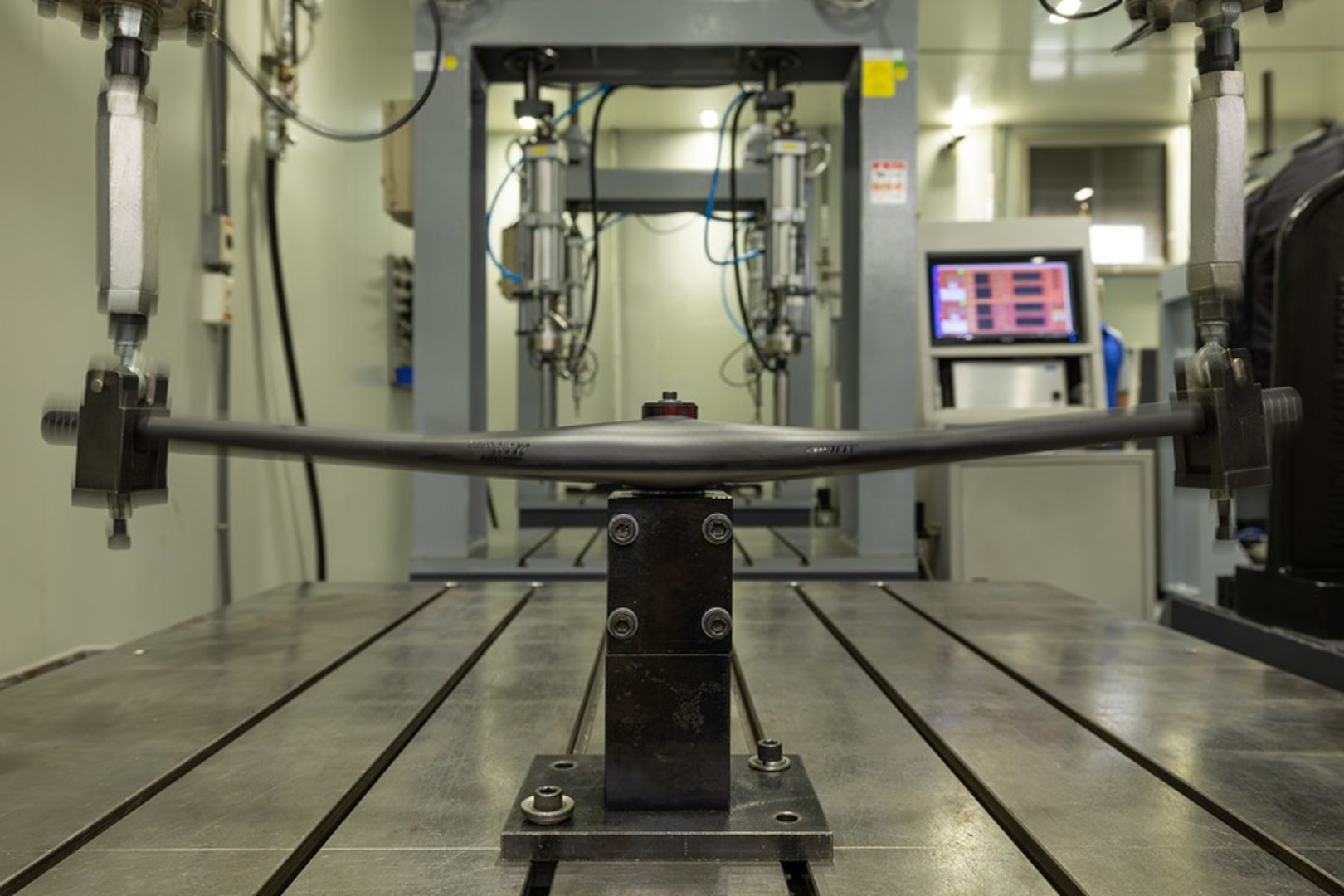We stappen een ruimte vol beweging en pneumatische herrie in. Frames, wielen en sturen laten zich gewillig mishandelen in deze martelkamer. Iedere minuut van iedere dag worden onderdelen hier onderworpen aan vermoeidheidstesten. Volgens Giant twintig procent bovenop de internationale ISO-standaarden. Allemaal zodat de consument erop kan vertrouwen dat Giant-producten niet falen.