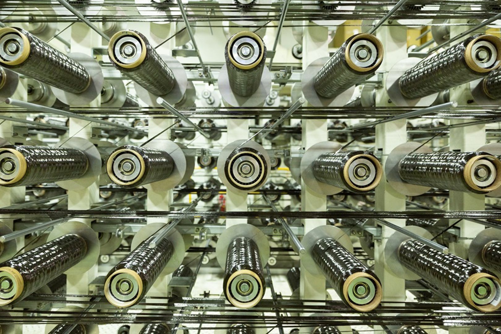 Een kakofonie van ontluchtende machines en draaiende rollen domineert de ruimte. Het onder TL-licht glimmende carbondraad wordt door geleiders, persrollen, kwaliteitsscanner en lamineermachine omgeturnd in carbonplaat.