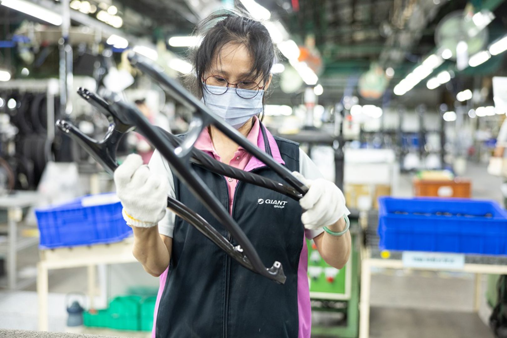 Om ons heen de ene fabriekshal na de andere. Achter iedere openstaande deur wordt gewerkt. Met tweeduizend medewerkers zie je overal personeel in Giant-jasjes, roze voor de vrouwen en blauwe voor de mannen. Het krioelt van de productie. Niemand fietst hier en toch is iedereen er mee bezig.