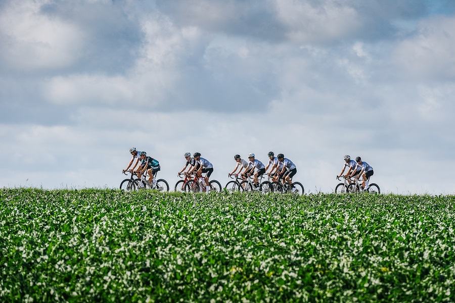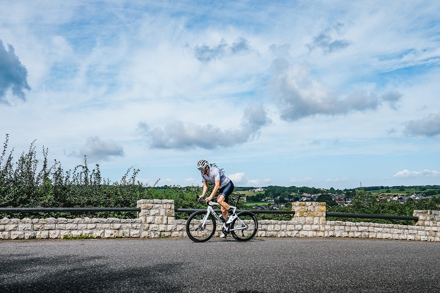 Als de bidons gevuld zijn, de bandjes op spanning staan en de route is ingeladen, vertrekken we richting de heuvels. Ik neem me voor om rustig te starten en voorzichtig kennis te maken met de Tarmac. Daar denkt de rest van de groep heel anders over. Het gas gaat er meteen op.