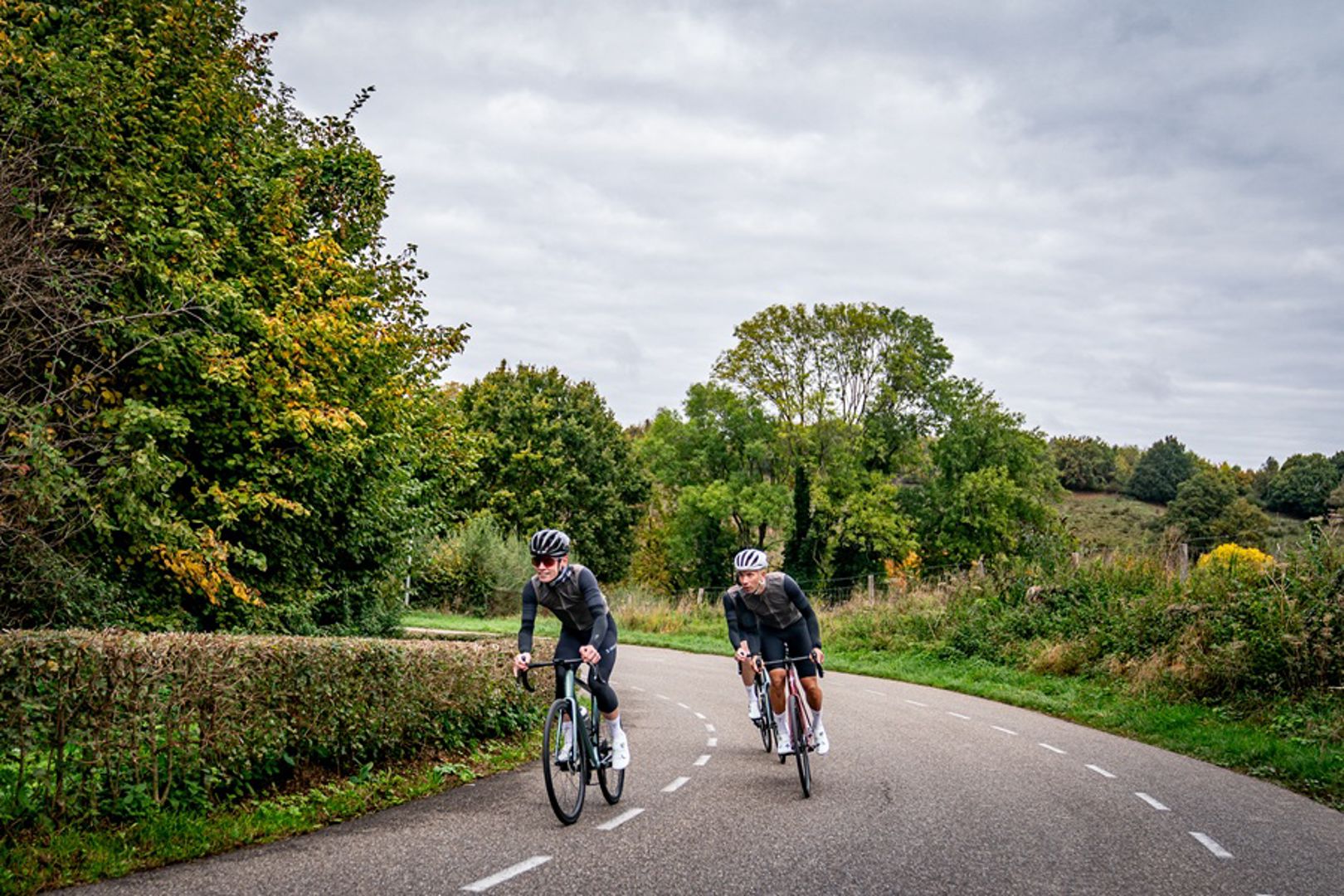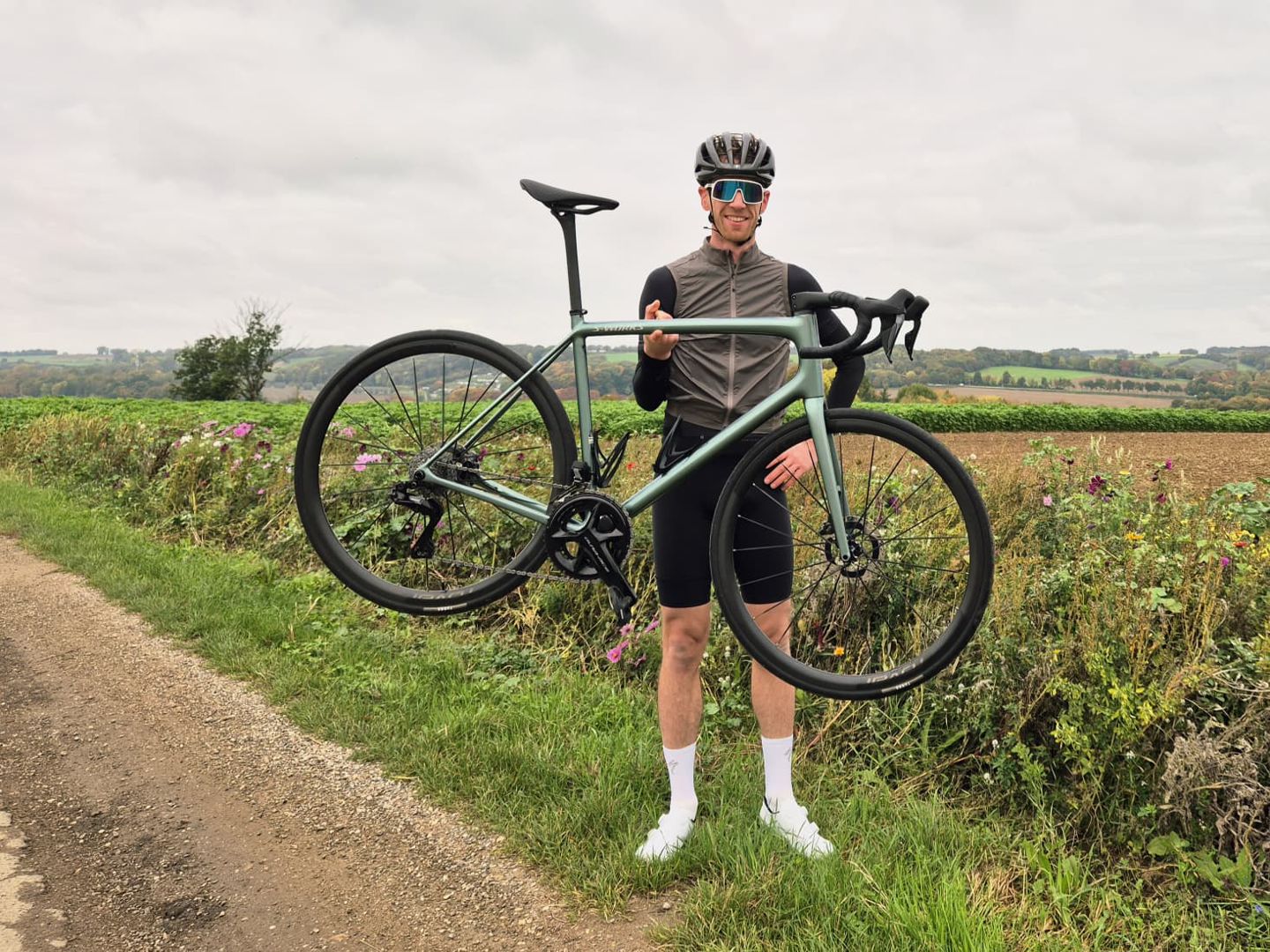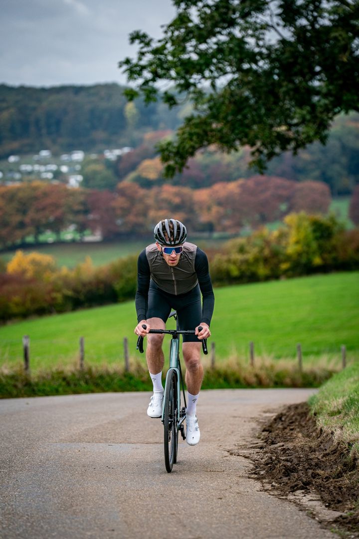 In de korte afdalingen is het even wennen. Alsof je meer gewicht denkt nodig te hebben om zeker te kunnen dalen. Al maakt het de Aethos zelf niet onzeker, die blijft gewoon strak in positie. Ik zit minder diep dan op de Tarmac, wat vooral op het vlakke te merken is. Ook merk je hier minder hardheid in het frame, maar voelt het nog steeds als een rappe racefiets.