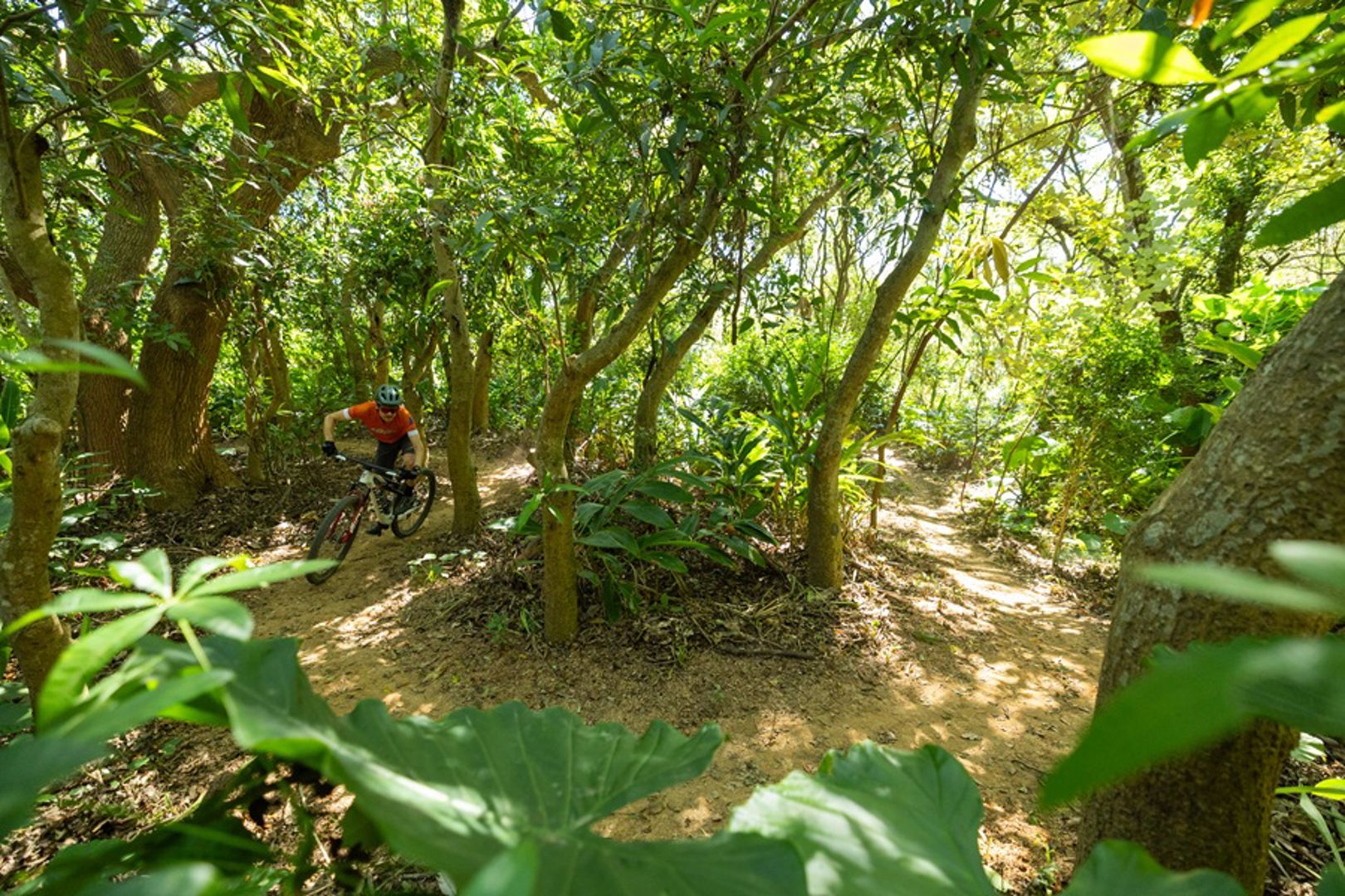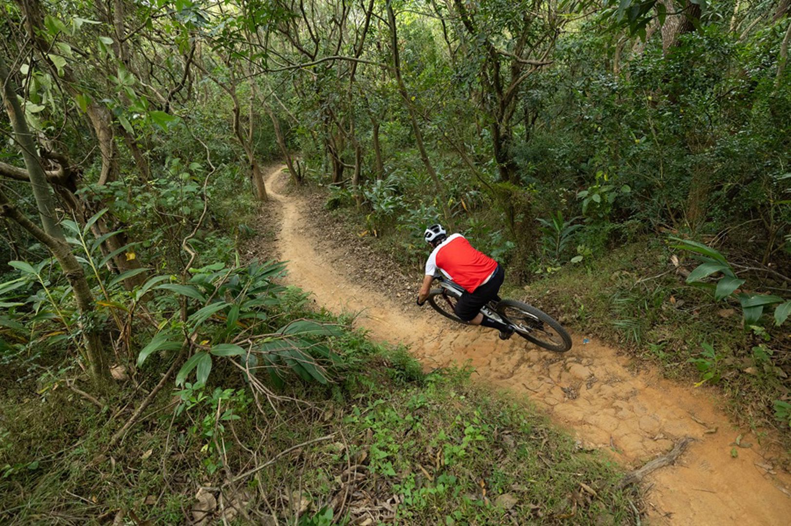 De exotische vlinders en vogelgeluiden, planten met megabladeren en immense muren van bamboe proberen mijn blik van het pad te leiden. Onhandig want het ruige terrein vraagt aandacht. Toch kan ik ronde na ronde meer overlaten aan de fiets. “Vertrouw me maar”, lijkt hij te zeggen.