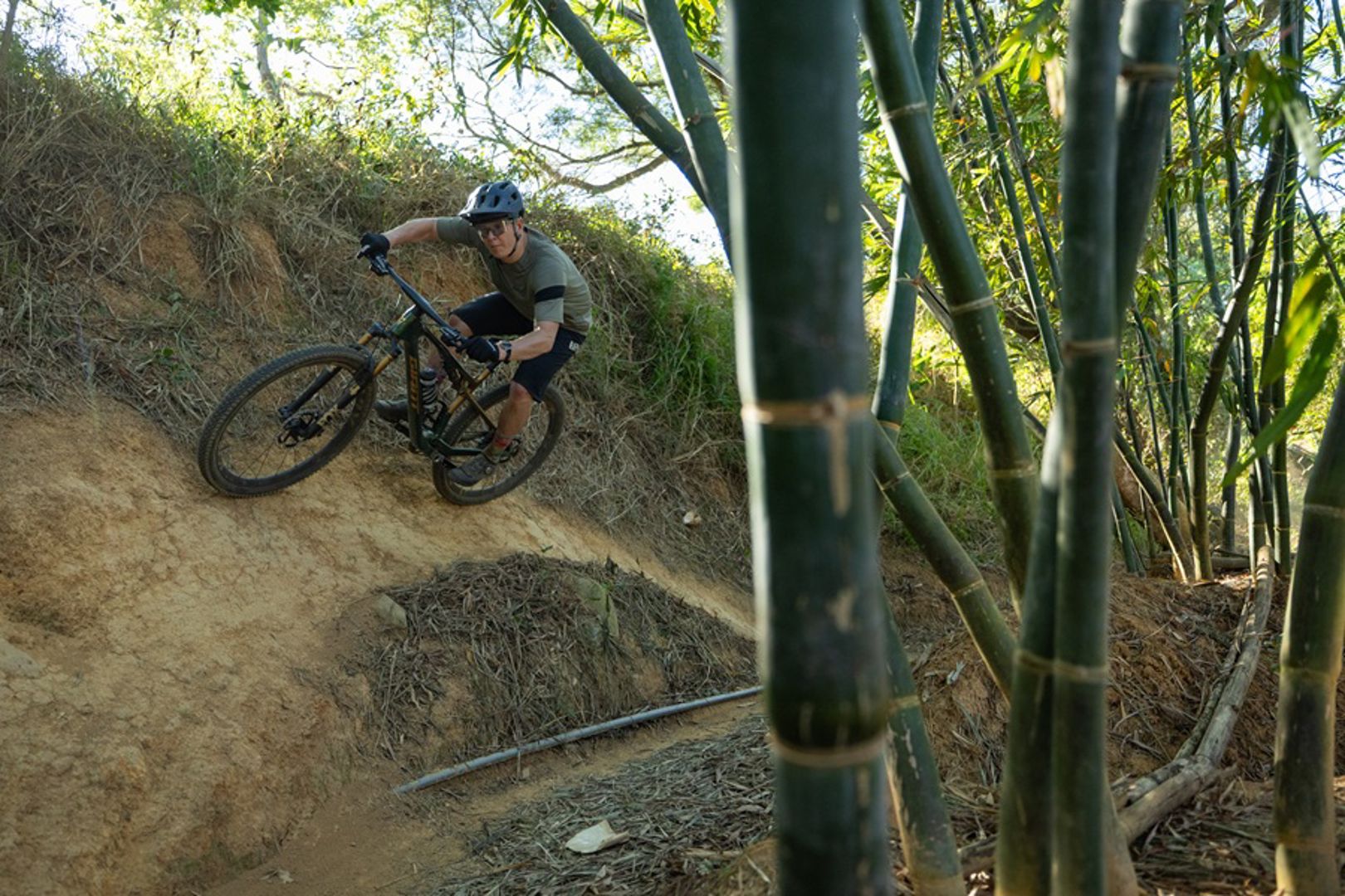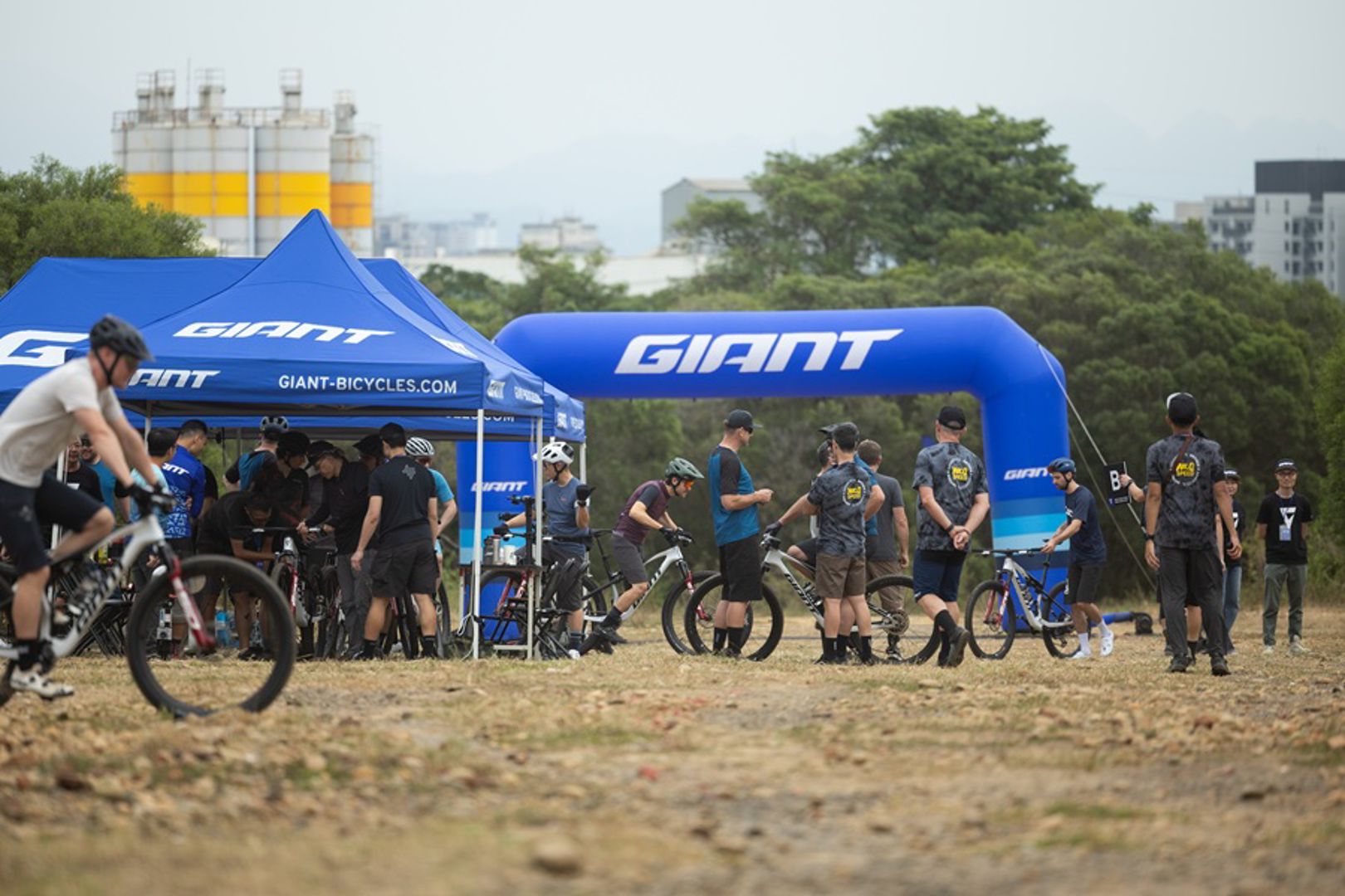 Van het huis van Giant naar het thuis van de mountainbike. Midden in de stad Taichung lopen we een jungle in. Hier liggen twee uitdagende parcoursen klaar voor het testgedeelte van de launch. Een open veld is omgetoverd tot pitstraat. Een rits Anthems blinkt in de zon. Ik pak de mijne uit het rek en word bediend door twee mecaniciens. De fiets vormt zich naar hun adviezen en mijn wensen.