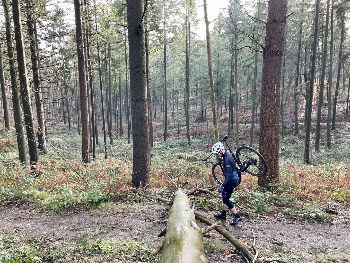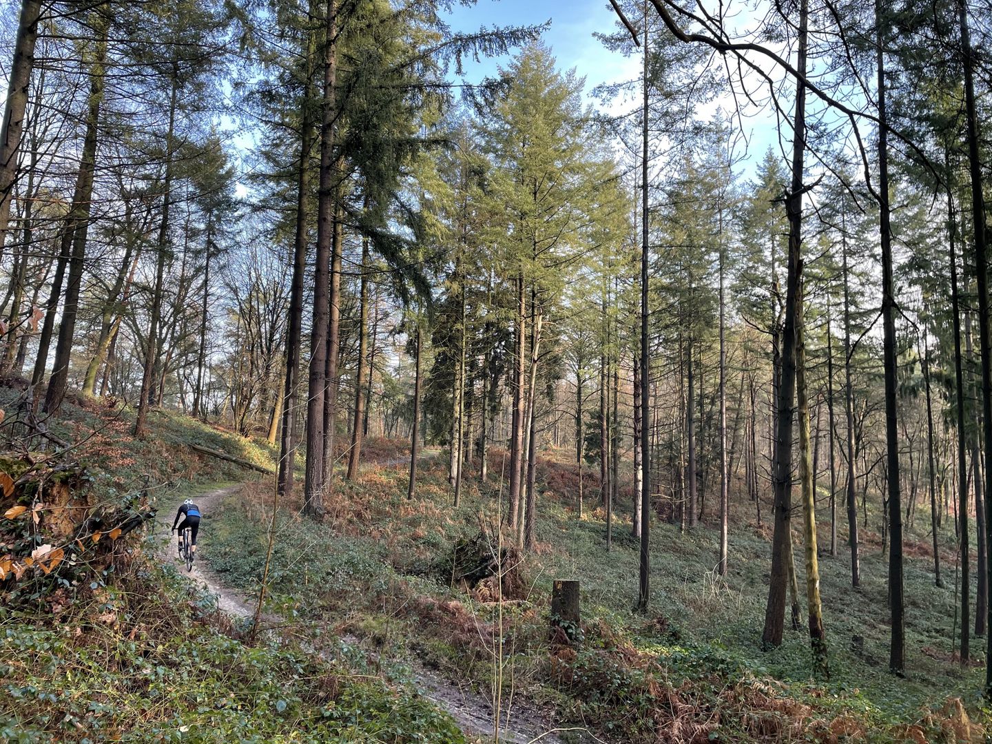 Na de klim volgt een serie bochtige singletracks die de Mathieu van der Poel in mij naar boven haalt. Wat een heerlijke gooi-en-smijtfiets. Je gooit de ‘kont’ makkelijk de bocht om en je kunt lekker scherp insturen. Dat crossgevoel is niet zo gek als je de geometrietabel erbij pakt. De cijfers tonen veel overeenkomsten met een veldrijfiets, alleen de wielbasis is wat langer voor extra stabiliteit.