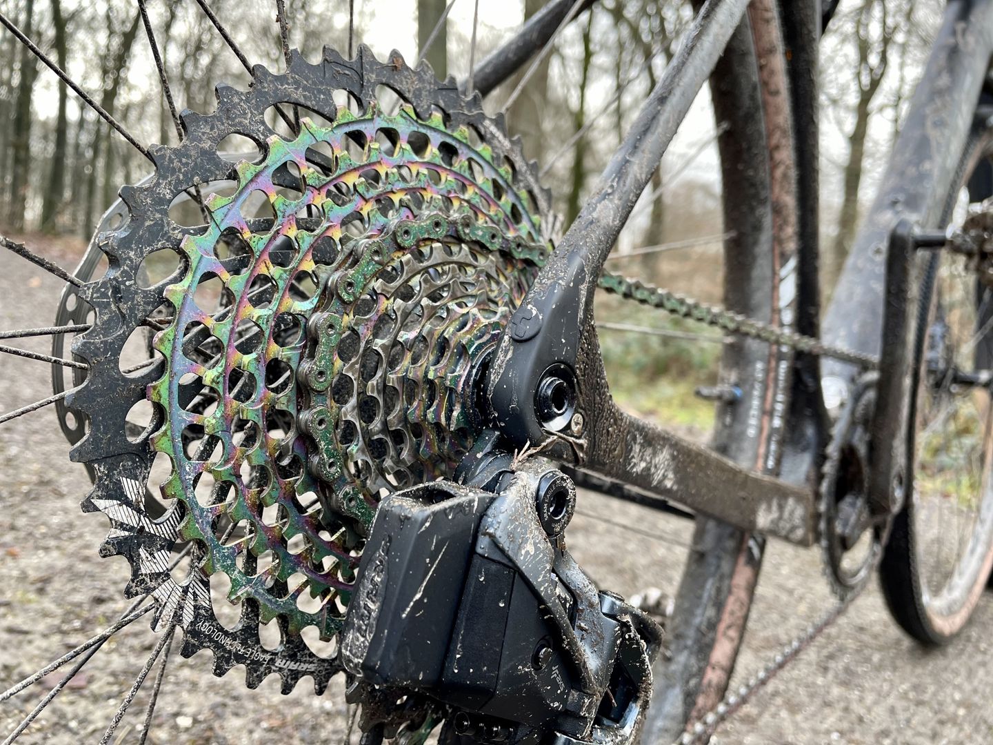 Na een korte warming-up over het asfalt, duik ik de eerste ‘strade bianche’ in. Ik trap de Nuroad goed op zijn staart en schiet weg bij mijn collega. Ik versnel door en schiet een brede grindweg in die steil omhoogloopt. Daar valt op hoe licht deze fiets is. Ik heb nauwelijks door dat ik op een gravelbike rijd. Veel gravelbikes zijn gebouwd voor comfort. Vaak voelt de fiets daardoor wat log en sloom aan. Niets van dat bij de Nuroad. Deze gravelbike is superlicht en lekker reactief. Elke trap is raak. Bovendien kom je met de Eagle-cassette met 10-50 vertanding overal boven. Of die mooie regenboogcassette echt nodig is, waag ik overigens te betwijfelen. Heb je een stevig stel polderpoten, dan kom je in de Veluwse, Limburgse en Sallandse heuvels ook prima boven met een 11-speed.
