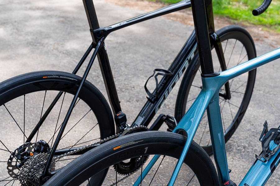 Er is nog een rits met kleinere veranderingen, ook intern. Volgens Giant is de fiets zo nog enkele procenten stijver en sneller, een besparing van 4.19 watt bij 40 kilometer per uur bij het topmodel. De afwerking is puntgaaf, van de lak tot de kleinste details. Voorzichtig bij het afstellen van de zadelhoogte, het systeem werkt goed maar het eerste krasje zit zo op de zadelpen. Nieuwsgierig naar het gewicht hang ik hem schoon, zonder accessoires, aan de haak; 7,75 kilo (maat L), ongeveer tien gram lichter dan z’n voorganger.