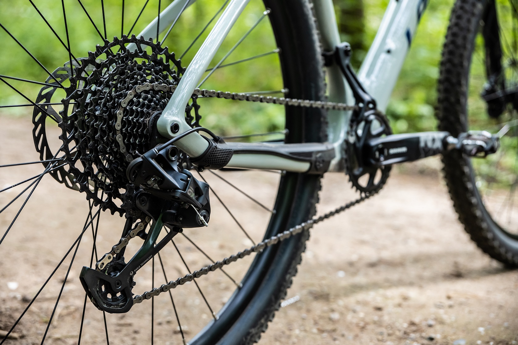 Bij het zien van de one by aandrijving heb je waarschijnlijk een déjà vu. Het is een versnellingsbak die bestaat uit een enkel voorblad in combinatie met een cassette van twaalf versnellingen, oplopend van 11 tot 50 tandjes. Eagle heet die cassette en komt net als de achterderailleur, ketting, crankstel en shifter uit de budgetgroepen van producent SRAM: SX, NX en GX.