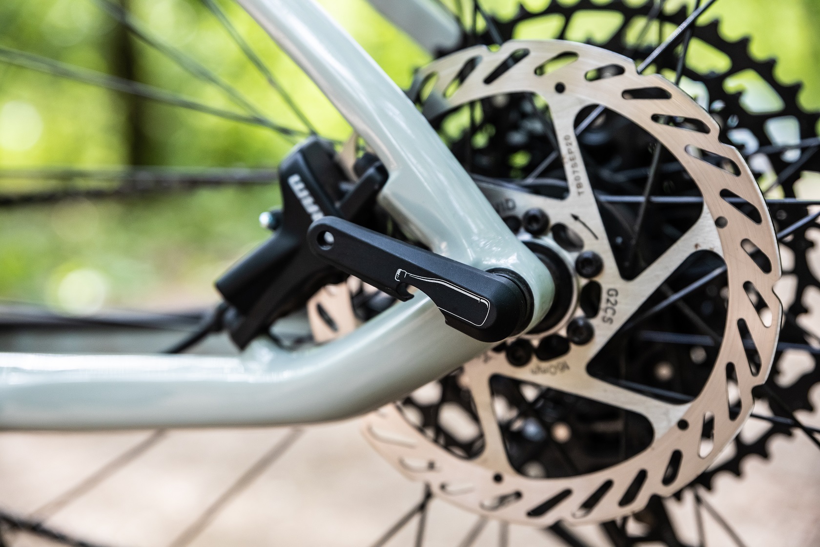 De voorband biedt een surplus aan grip. Strak stuurt de Prorace door de krappe bocht, waarbij het brede stuur fungeert als hefboom. Op één oor, want door de lange bovenbuis in combinatie met het onderuitgezakte balhoofd is de draaicirkel groot. Ook wanneer het pad steil naar beneden loopt houdt de bike zijn lijn. Daarbij helpen de twee stevige vorkpoten, met elkaar verbonden door een steekas, die het voorwiel in het spoor houden en zorgen dat de voorband in contact blijft met het terrein. Vorkpoten die je vanaf het stuur kunt blokkeren.