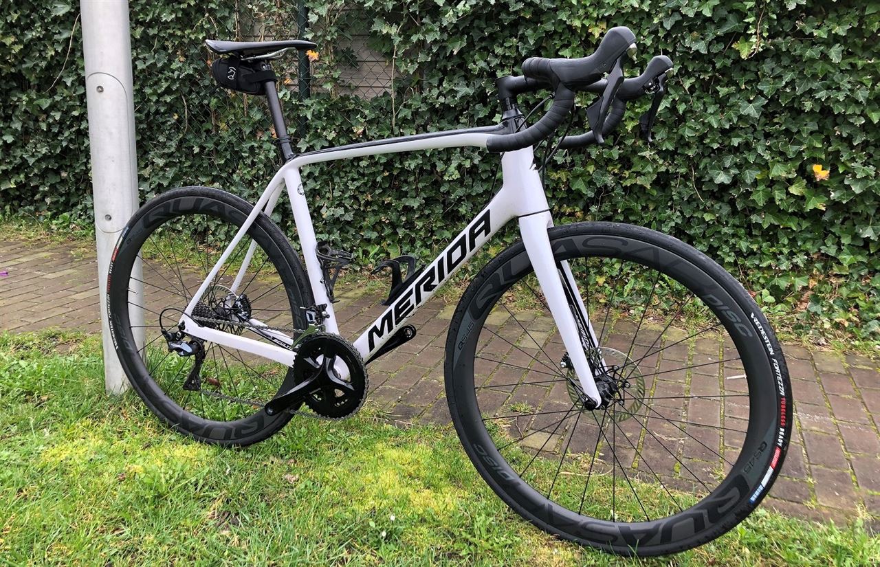 Ter vergelijking heb ik de velgen van mijn eigen racer even in de Scultura gezet (zie foto). Hoge velgen zijn aerodynamischer, maar ook schokgevoeliger. Extra comfort is wellicht de reden geweest om te kiezen voor een lage wielset. Er kan bij Merida dan ook niet gekozen worden voor een andere wielset. De Scultura is immers een endurance fiets.
