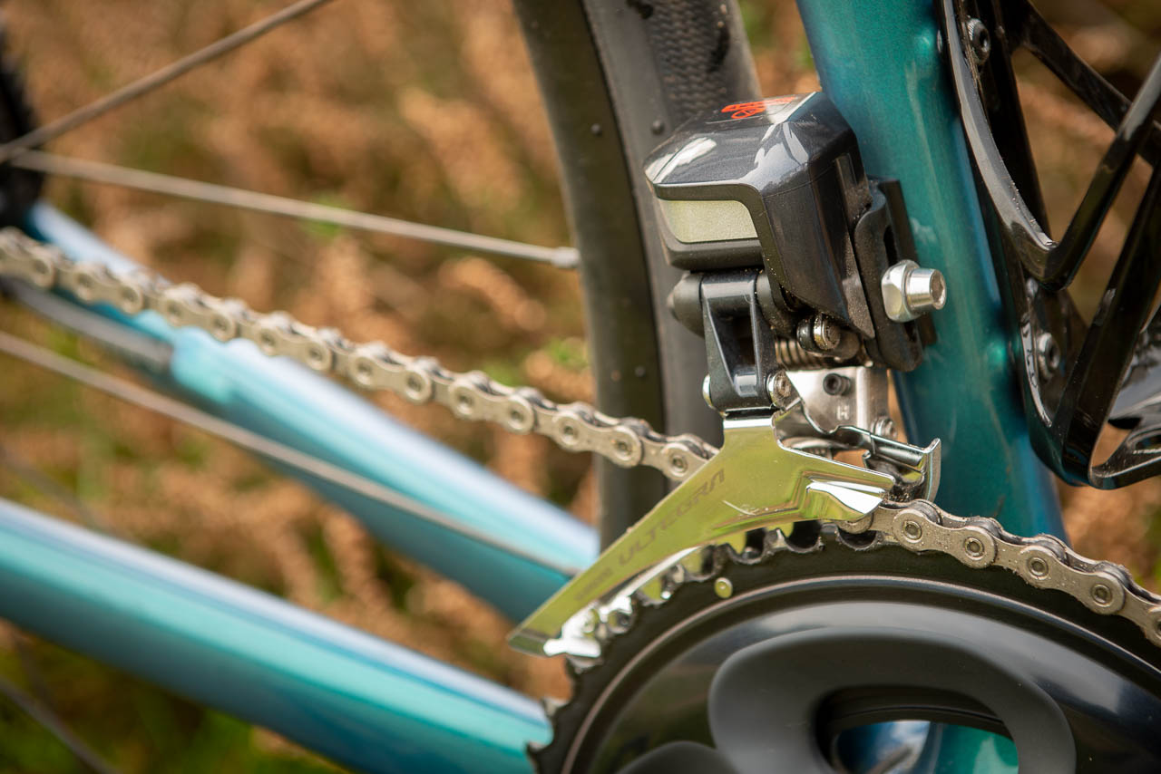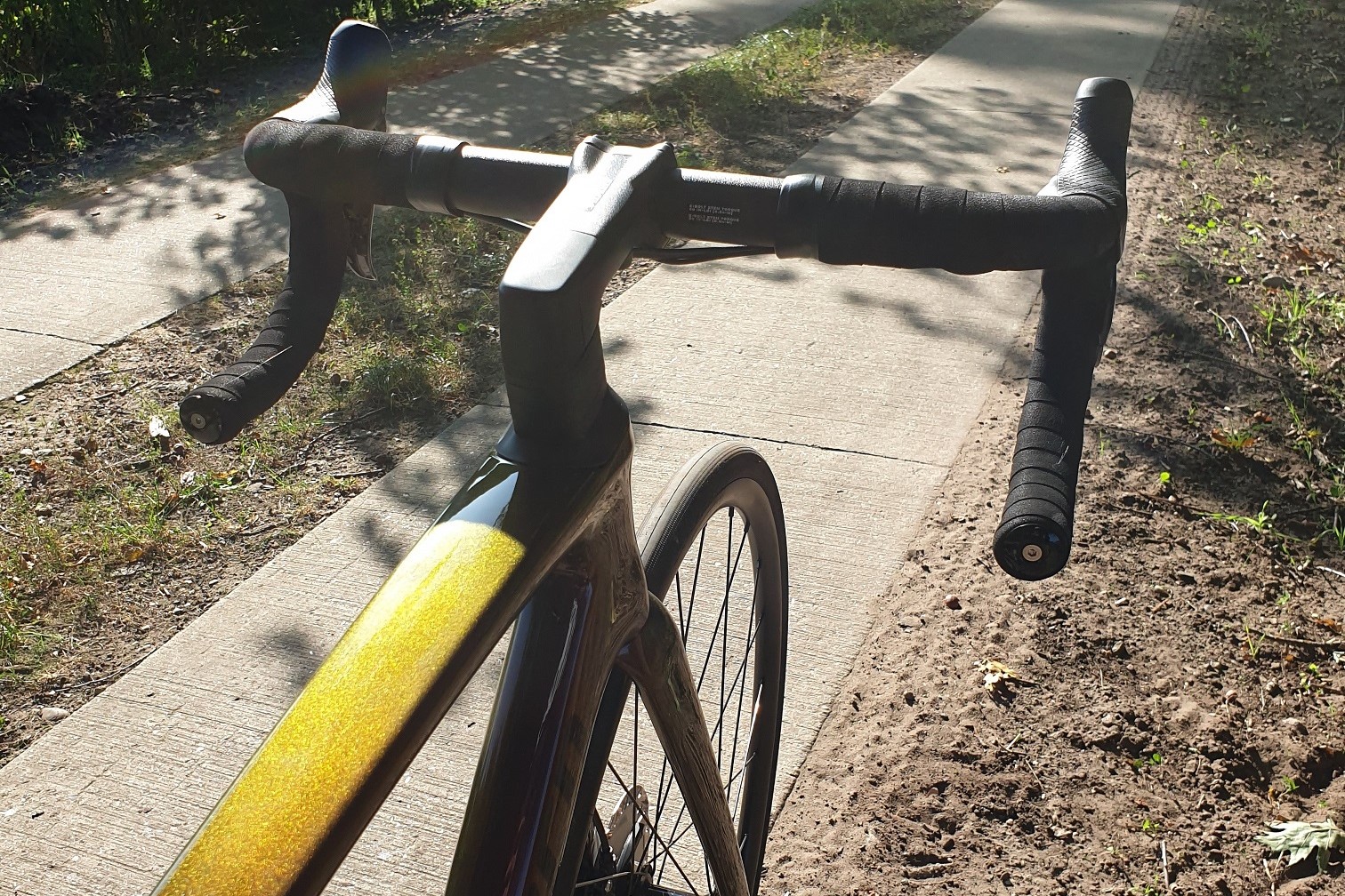 Een dikker stuurlint om het iets afgeplatte stuur had wat mij betreft wel gemogen. Het voelt vrij hard aan. Het Shimano Di2-systeem is, omdat de bedieningsknoppen vrij dichtbij elkaar liggen, even wennen, maar eenmaal gewend geraakt, schakelt dat razendsnel. Bochten kun je strak in sturen dankzij de efficiënte framegeometrie, elke aanzet is raak.