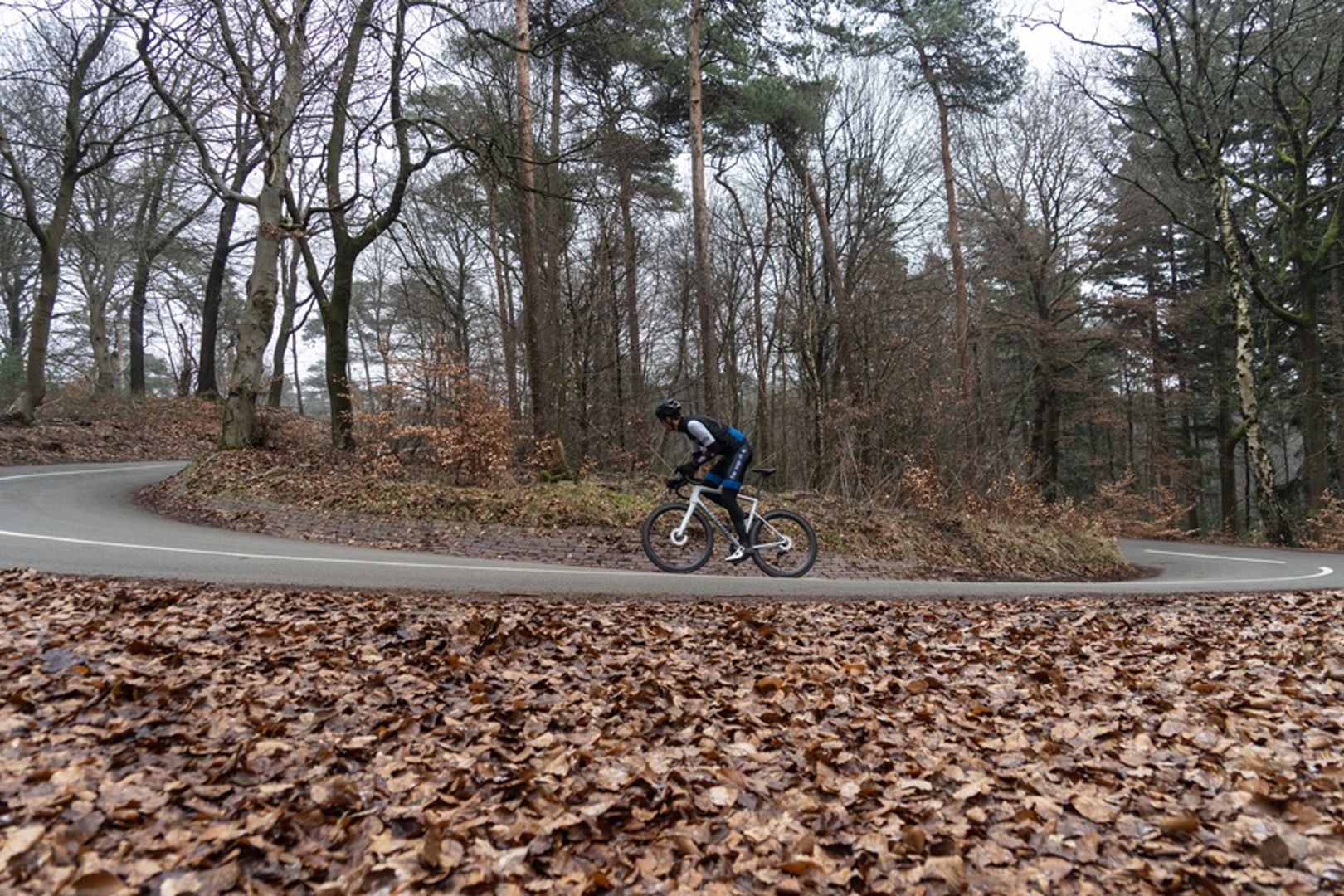 Op het vlakke bracht ik het testkarretje niet in de problemen. Tijd om de zwaartekracht mee te laten spelen. Met maatje 58, pedalen, bidonhouders en de meegeleverde 4iiii wattagemeter weegt dit speeltje zo’n 7,5 kilo. Lekker luchtig dus, zeker met zulke ‘dikke’ wielen. Natuurlijk kan je nóg lichter omhoog fladderen, maar we gaan erg soepel omhoog.