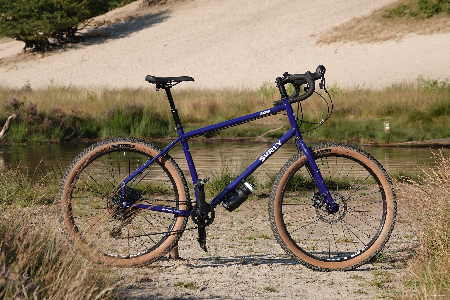 Kort door de bocht heeft de Grappler mountainbiken écht in de genen zitten. De geometrie neigt wat meer naar die van moderne mountainbikes, de kleinere wielmaat (27,5") duw je in theorie wat makkelijk door krappe singletracks en met de geïnstalleerde dropper post heb je wat meer bewegingsruimte om de randjes op te zoeken. Als je dat zo opsomt, is het niet zo gek dat Surly de Grappler beschrijft als een "dropbar trail mountainbike", als is het verschil met een fully natuurlijk gigantisch. Tenzij je over de skills van een Red Bull freestyle mountainbiker beschikt, zou ik je niet aanraden om double-black-diamond routes te fietsen. Een vaderlands singletrackje hier en daar moet echter geen enkel probleem vormen voor de Grappler.