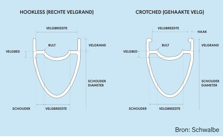 - Zorg ervoor dat de band die je wilt aanschaffen 100% geschikt is voor hookless. Let op het model en de maat. De officiële benaming voor haakloze velgen is overigens TSS (tubeless straight sidewall).