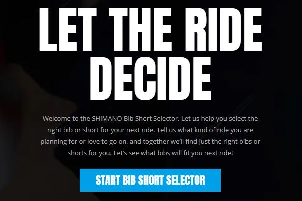 De Bib Short Selector stelt een paar eenvoudige vragen over het type rit en het intensiteitsniveau voordat de keuze voor de meest geschikte (Shimano) koersbroek wordt teruggestuurd over drie verschillende soorten rijstijlen: