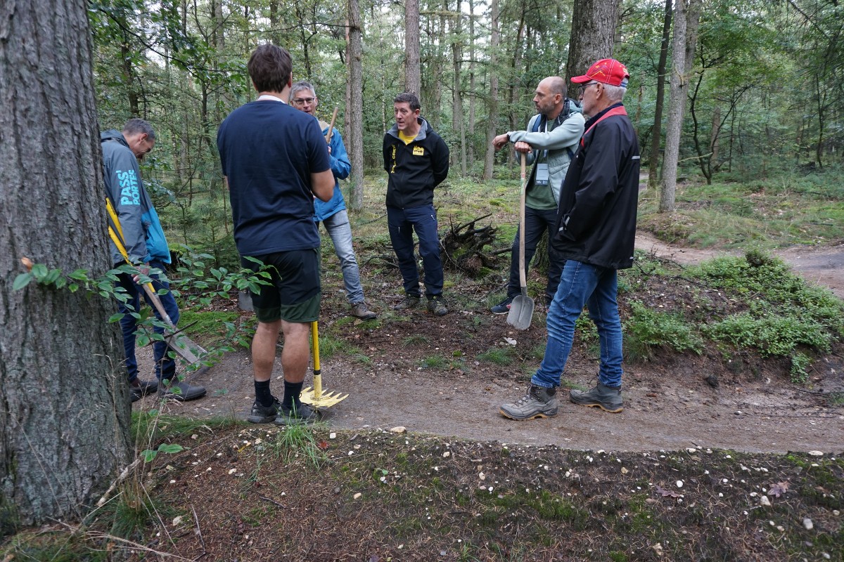 Genoeg van al dat zitten en luisteren! ’s Middags was het tijd voor actie. Gewapend met schop en McLeod (een flink stuk gereedschap dat een schoffel en een grove hark in één is) gingen de trailcrews de mountainbikeroute van Ede op. Want hoe bouw je zo veilig mogelijk een technische uitdaging als een kuipbocht? Niemand minder dan Patrick Jansen en Eric Kuijt – beide professioneel routebouwer en in te zetten voor professioneel onderhoud via