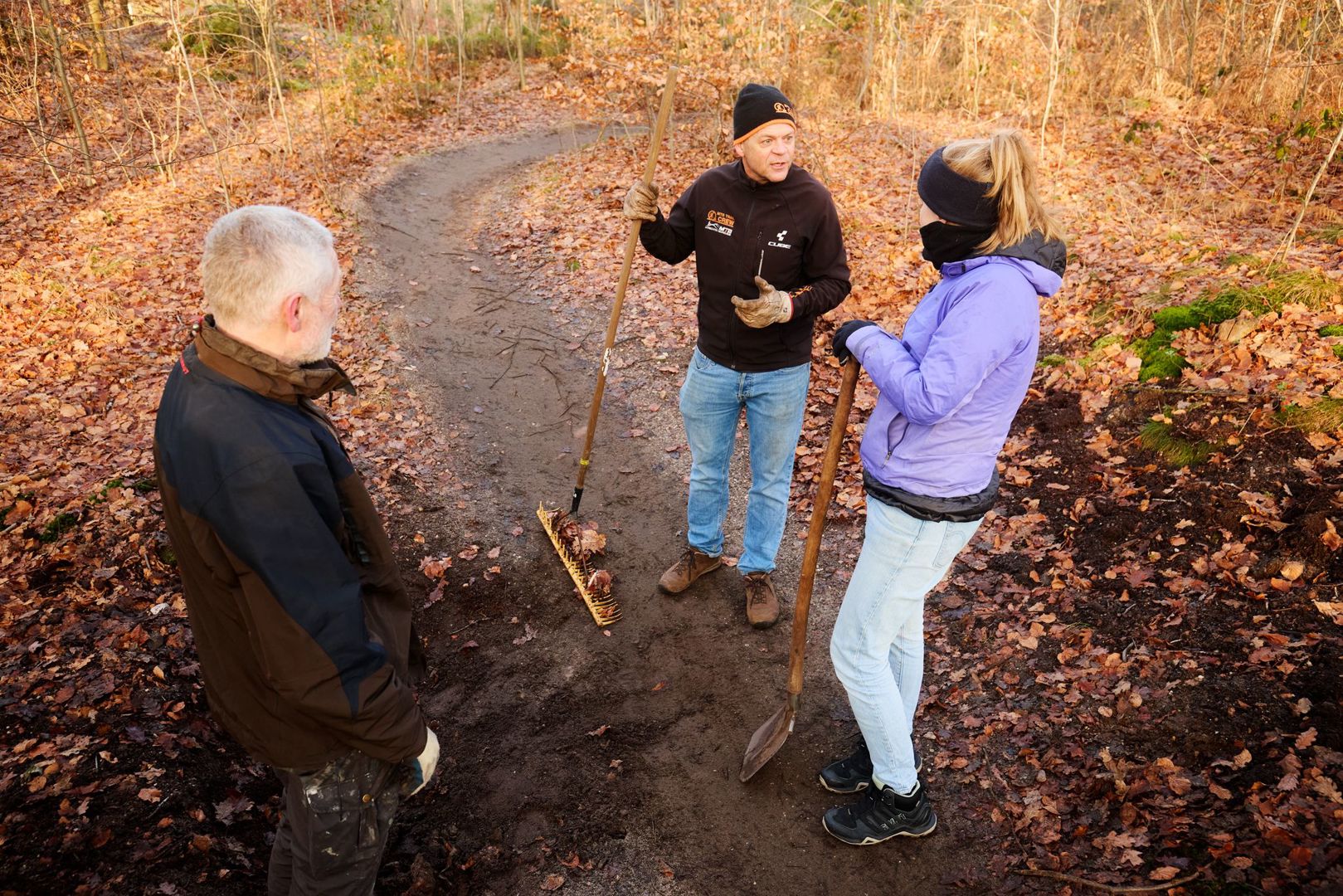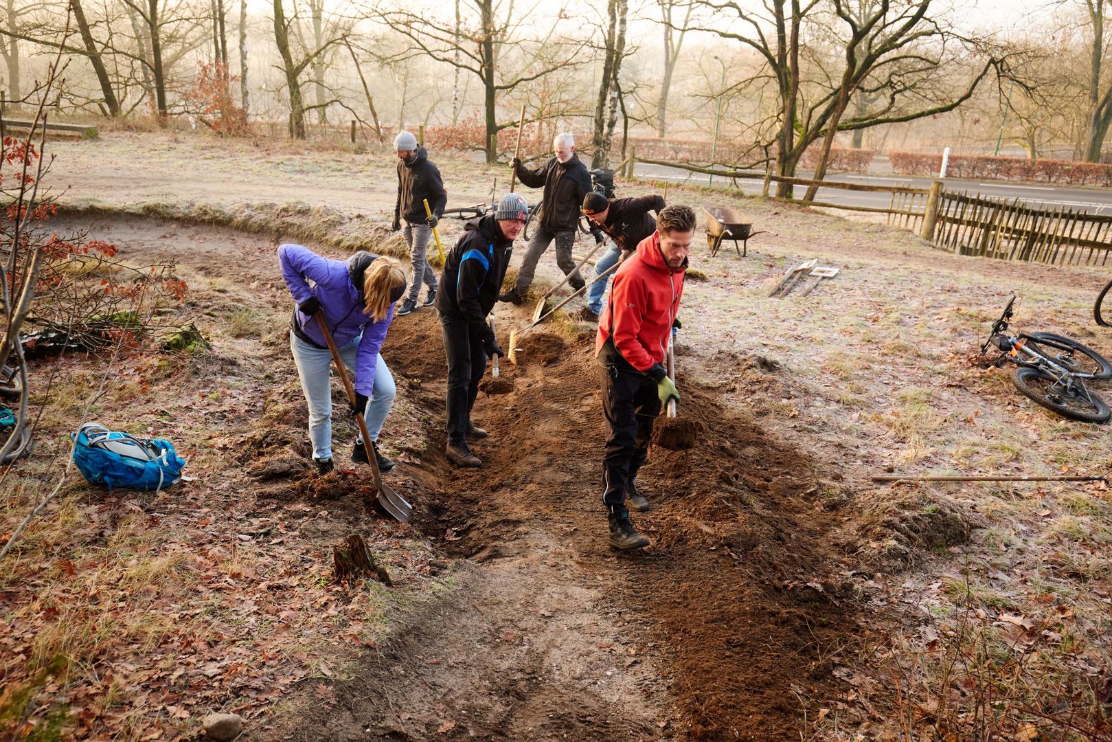 We spraken af op de parkeerplaats bij Soester Hoogt, het vertrekpunt voor een dag werken aan de trail bij De Bergjes. Aan de rode lus - moeilijk dus - op de route van Soest, midden op de Utrechtse Heuvelrug. Samen met zeven collega’s liep ik een dag mee met de trailcrew. Schep, hark en ander gereedschap in de hand. Zien, voelen en begrijpen wat er allemaal komt kijken bij het onderhoud van de trails waar het voor mountainbikers uiteindelijk om draait.