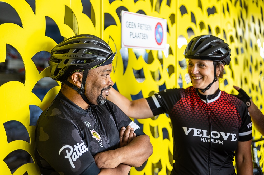 Timothy knikt: “Vrouwen zie je best vaak op de fiets, maar donkere mensen amper. Nu rijdt er in Amsterdam ineens een groep donkere mensen langs, wij dus. Natuurlijk krijgen we dan opmerkingen. Maar ook sympathie. In het begin stond ik langs de weg met een lekke band, stopte een man en die heeft hem voor me verwisseld. Maar er wordt ook wel eens wat geroepen. ‘Hey Joop Chocomel!’ Ach, ik kan wel wat hebben. Ik kom uit het voetbal, daar is racisme echt de horror.”
