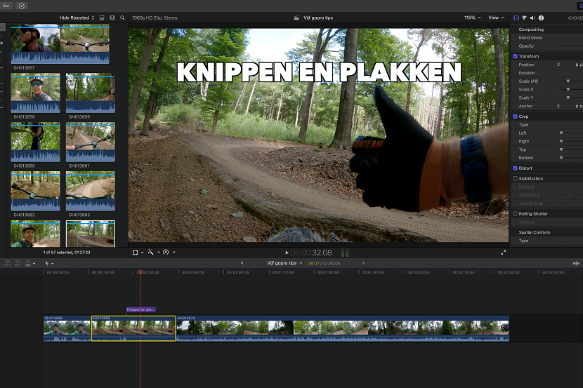 Laat vooral weg wat niets toevoegt. Het mooie uitzicht hebben we na een paar seconden wel gezien. Dat hoeft er geen 15 seconden in te zitten. Knip die lange klim op in een paar korte stukjes. We hoeven hem niet helemaal te zien. Zit je drinkslang een deel van de afdaling voor je lens? Laat dat stukje weg. Kies alleen de mooiste shots!