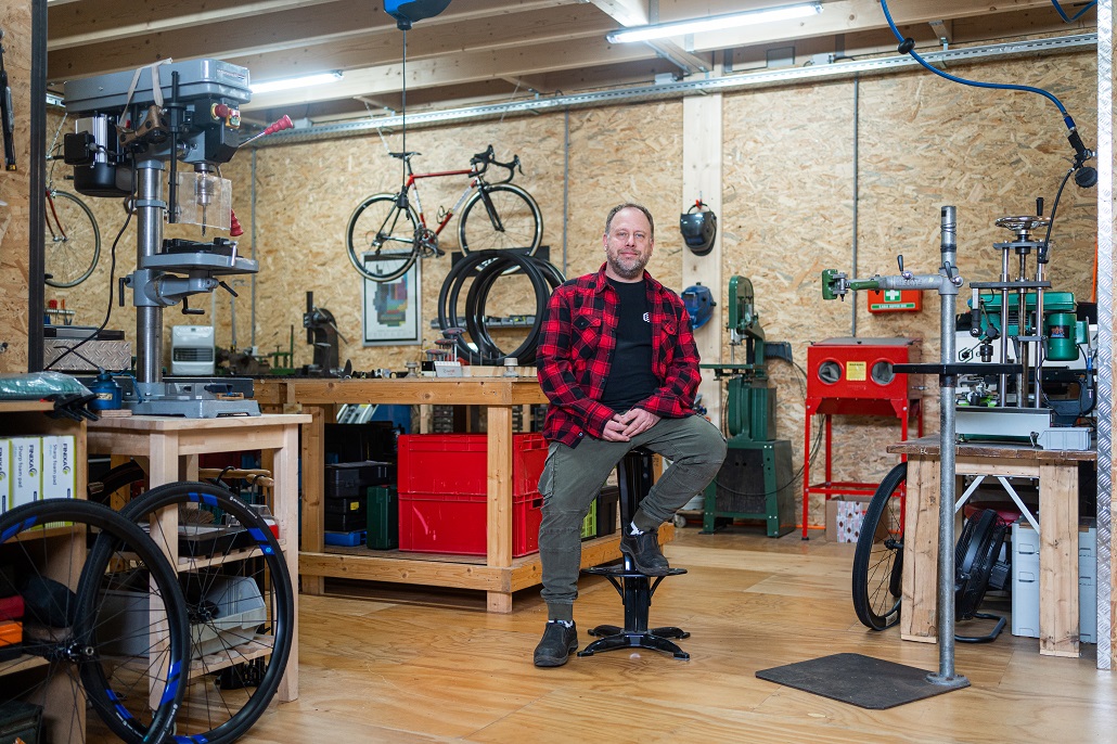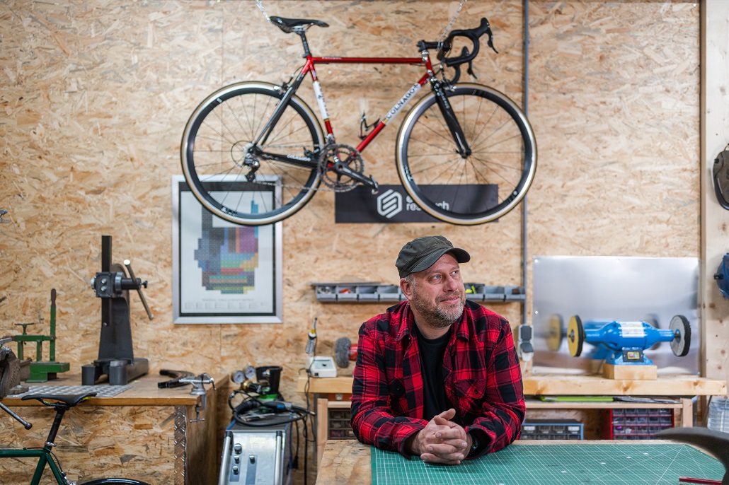 Aan de muur drie vintage fietsen: een prachtige Colnago (“Cadeau gekregen van Ernesto Colnago”) en een Gazelle die ooit als reservefiets diende voor de Dextro-ploeg van Mieke Havik. En een Concorde. Hij aait de laatstgenoemde. Mijmerend: “Zo jammer dat Nederland niet meer meedoet als racefietsmerk op mondiaal profniveau.”"Ja, in rommel kan ik niet werken. Hier maak ik alle prototypes, doe ik de testen, alles"