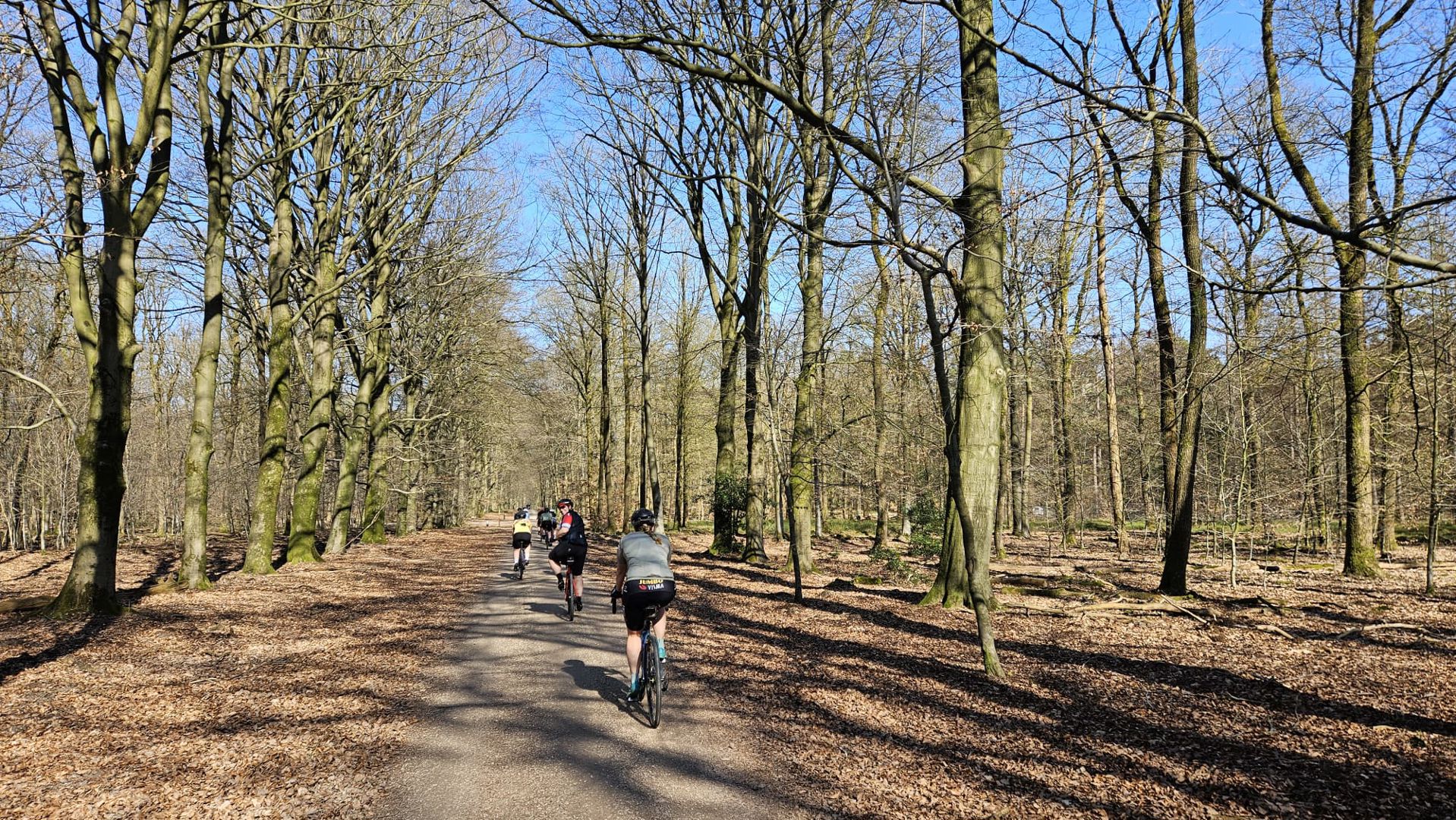 Marina heeft een prachtige route van 65 kilometer over de Veluwe uitgezet. Het is haar gelukt een route te vinden met brede paden, zodat we als groep kunnen fietsen. We worden van de open vlakten richting het bos gestuurd waar de lentezon prachtig door de bomen schijnt. We zoeven door het Kroondomein over stoffige grindpaden en schudden over hobbelige karrensporen. Er zijn geconcentreerde blikken als we door mul zand sturen en stralende gezichten als na elke bocht de Veluwe zich als een ansichtkaart presenteert.