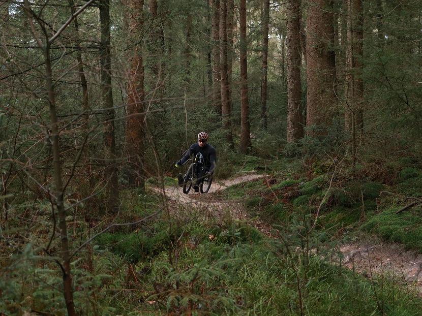 Tijdens een pittige klim met meerdere grote boomwortels kiest hij de perfect lijn en komt hij met gemak boven. Erg netjes, want ik zie hier ook mensen afstappen die rijden op gewone mountainbikes.