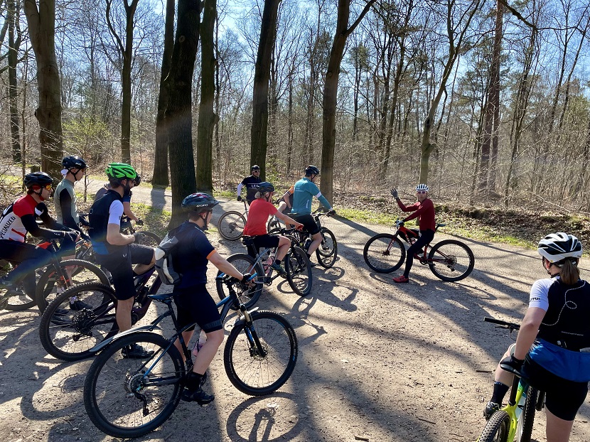 Een half uurtje later zat iedereen op de fiets. In het spoor van Patrick gaven we onze mountainbikes de sporen over de slingerpaden van MTB-route Schaarsbergen. Onderweg gaf de routebouwer Patrick tekst en uitleg over flora, fauna, natuurbelangen en nog veel meer.