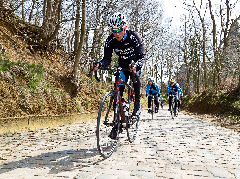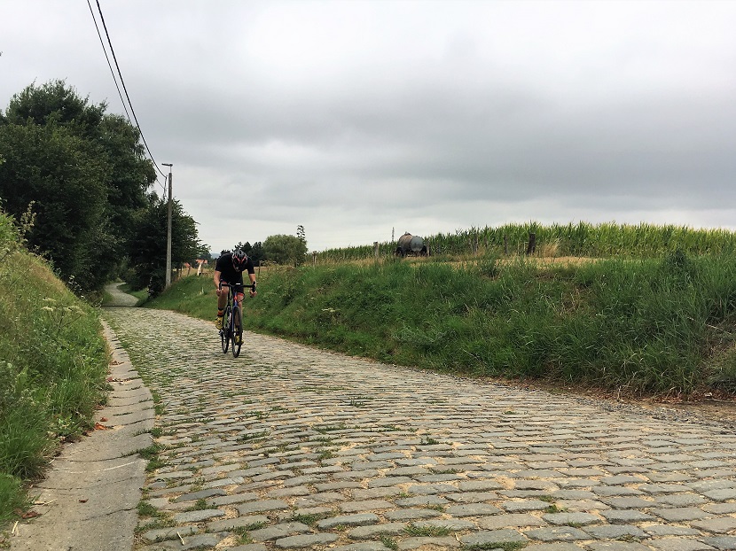 Stilvallen is hier funest en staan op de pedalen is geen optie want je verliest gegarandeerd je grip. Met maxima tot 22% en een gemiddelde van ruim 11% gunt de Koppenberg je geen moment rust. Pas bij de huizen is het lijden over. Kijk dan vooral achterom en zie hoe de weg zich hier tussen de bomen naar beneden stort. Na een klein stukje bergaf klim je de laatste 300 meter over asfalt naar de top.