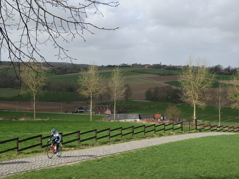 Qua lengte stelt de Paterberg eigenlijk niets voor. Nog geen 400 meter duurt de lijdensweg. Want pijn doet ‘ie zeker. Tussen de weilanden door loopt de weg bijna kaarsrecht omhoog. De aanloop valt nog meer, maar dan volgt het steilste stuk (20%) langs de houten hekken. Ineengedoken op je stuur, zoekend naar evenwicht, rol je tergend langzaam van kassei naar kassei. Bovenop wacht de rust in de vorm van twee houten bankjes. “De Paterberg bestijgen betekent zweten en hijgen”, staat op het ene bankje. “Geniet hier van het zicht op het landschap dat voor je ligt”, vermeldt het andere. Afzien en genieten, dat is de Paterberg in een notendop.