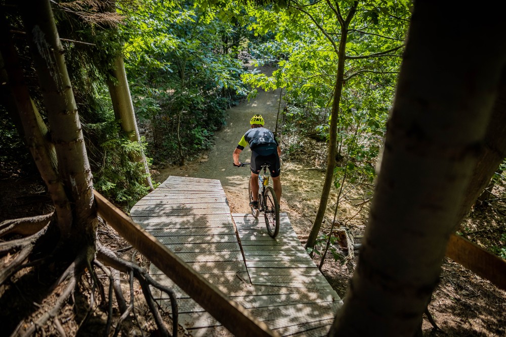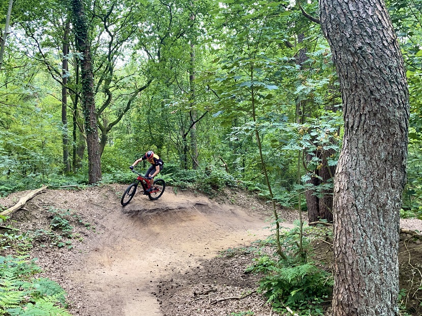 De rode route is voor gevorderde mountainbikers. Op de singletracks kom je regelmatig moeilijke afdalingen, hoge boomwortels, springbulten, rockgardens en drop-offs tegen. Je moet hier dus flink aan de bak en zeker zijn over je technische vaardigheden op de mountainbike.