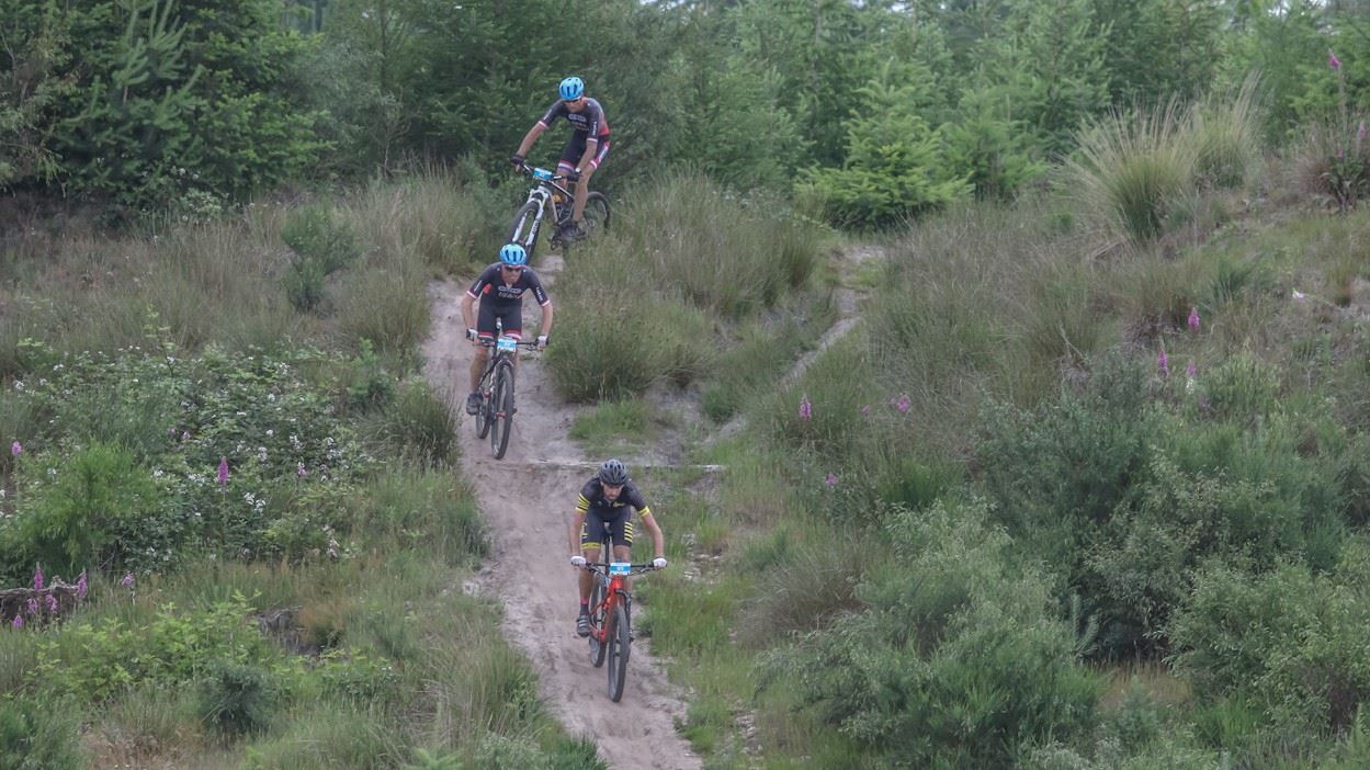 Na zo’n 10 km is er lekker de ruimte en blijkt dat we de eerste klimmen bij Exloo overslaan. Dit was een plek waar vorig jaar opstoppingen ontstonden, dus een wijs besluit van de organisatie. A snel komen we in de geweldige omgeving van Sleen waar we bij de Kibbelkoele lekker klimmen, keren en dalen op de heerlijke singletracks.