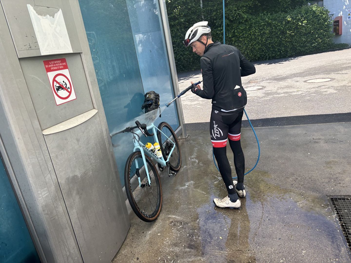 Ik zet met de Strava app op mijn iPhone een nieuwe route uit. Deze loopt grotendeels langs de rivier. We hoeven nauwelijks meer te klimmen en lopen met enig geluk een wolkbreuk mis. Terwijl achter ons de donkergrijze wolken afdrijven richting Duitsland, spuiten we bij een carwash bij Visé de fietsen schoon.