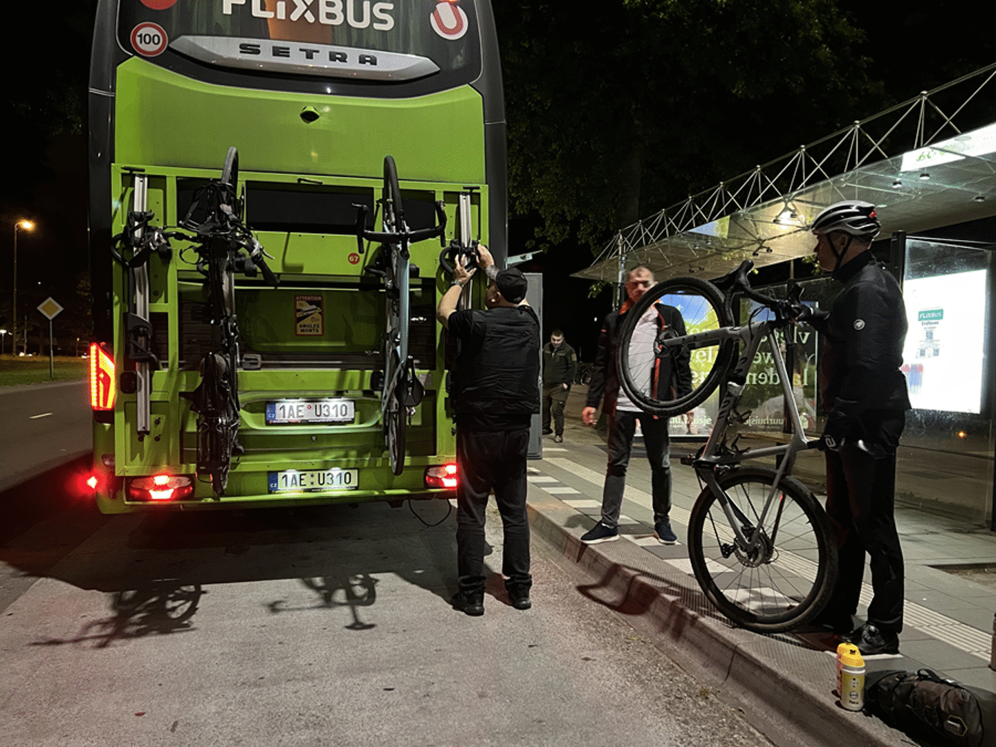 De laatste treinreizigers haasten zich door de poortjes. Op de stationsklok tikken de secondes weg. Rond één uur ’s nachts fietst mijn reisgenoot de hal binnen en tegen half twee verschijnt een straat verderop een Flixbus uit de duisternis. Samen met de chauffeur hangen we onze gravelbikes op de steunen achter op de touringcar en dubbelchecken of alles goed vastzit. Instappen maar. Op naar Parijs.