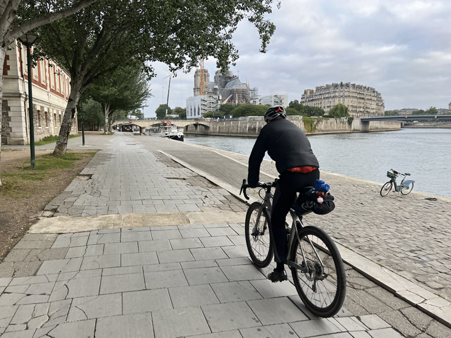 kilomètre zero tegel voor de Notre Dame. Vanaf dit punt worden alle afstanden naar Parijs gemeten, wat ons betreft een mooi beginpunt voor dit bikepackingavontuur. Daarna rijden we via het Louvre naar de Eiffeltoren, waar we ontbijten. Vervolgens gaat het via de Arc de Triomphe naar Montmartre. Daar genieten we even van het uitzicht bij de Sacre Coeur.