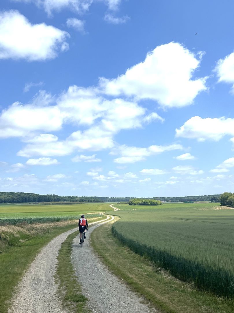 Als we uiteindelijk van het kanaal wegdraaien krijgen we de eerste gravelstroken voor de wielen. Om ons heen golvende landbouwgronden met wuivend graan. Dat we nog dicht bij de stad zijn merken we alleen aan de vliegtuigen die laag overvliegen, op weg naar de luchthavens van Orly of Charles de Gaulle.