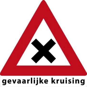 Dit bord waarschuwt je voor een gevaarlijke kruising met een wandel- of fietspad of verkeersweg. Gas terug en kijken of je niemand hindert.