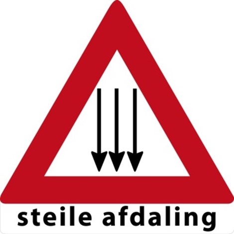 Niets mooier dan een technische, steile afdaling. Dan moet je die uiteraard wel zien aankomen. Afdalingen die plots opdoemen, herken je aan onderstaande borden. Twee pijlen betekent dat er een steile afdaling aankomt. Bij drie pijlen is de afdaling zeer steil.