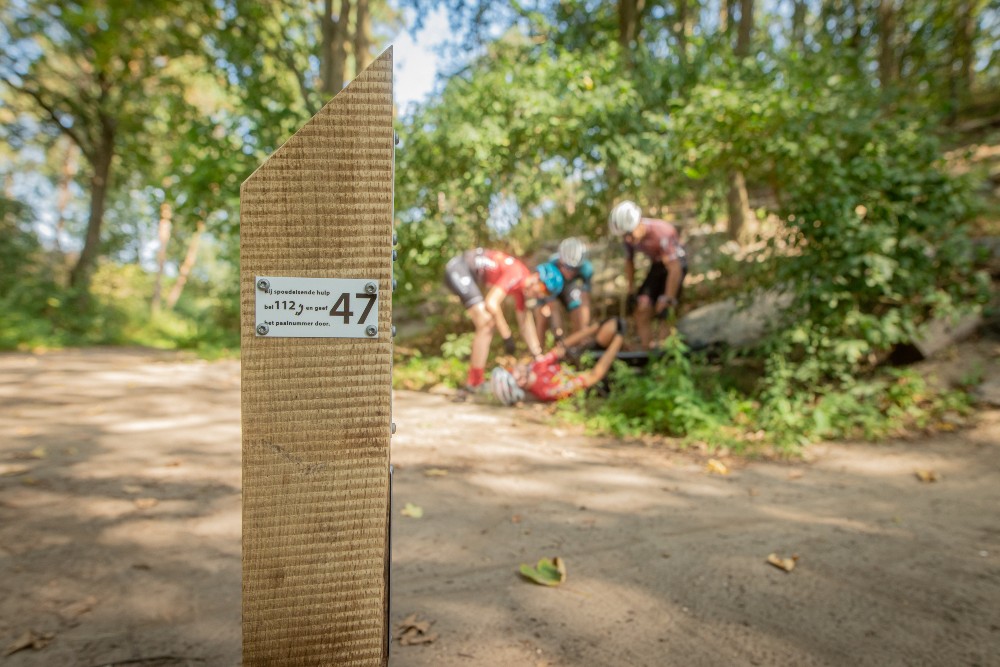 Een ongeluk zit in een klein hoekje, zeker bij mountainbiken. En zo'n ongeval gebeurt vaak in afgelegen plekken en dus lastiger te vinden voor de hulpdiensten. Daarom hangen er langs steeds meer routes een bordje met een locatiecode erop. Als je 112 moet bellen voor een mountainbiker die zwaar gewond is, kun je deze locatiecode doorgeven aan de meldkamer. Deze code is bekend bij de hulpdiensten, zodat ze direct weten waar ze precies naar toe moeten.