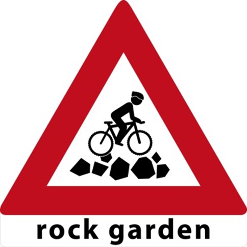 Dit bord waarschuwt je voor een verzameling stenen, oftewel een rock garden. Fiets dit technische element alleen wanneer je voldoende techniek en ervaring hebt.