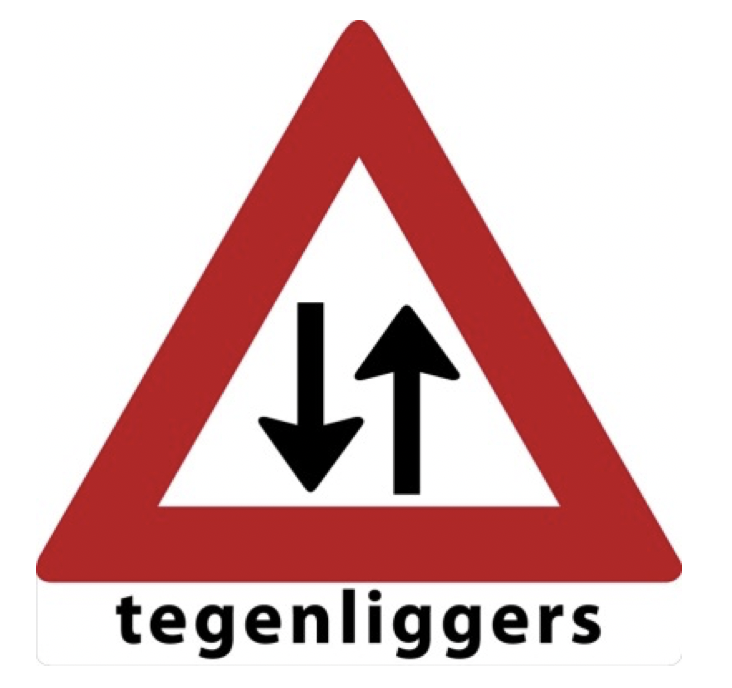 Op trajecten waar je tegenliggers tegenkomt of langs een smal en onoverzichtelijk pad waar tweerichtingsverkeer overheen gaat, wordt je gewaarschuwd met onderstaand bord. Maak plaats voor een ander, minder vaart en ga achter elkaar rijden als je in een groep rijdt.