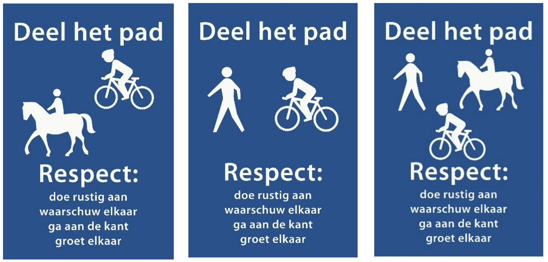 Zoals we al zeiden, Nederland is een klein landje. Dat betekent dat we onze speeltuin moeten delen met anderen. Wandelaars, ruiters en andere fietsers maken soms gebruik van hetzelfde pad. Helemaal niet erg. Wij kunnen namelijk prima delen! Zie je onderstaand bord? Houd dan rekening met andere gebruikers. Minder vaart, groet vriendelijk en passeer veilig. Daarna kan het gas er weer op!