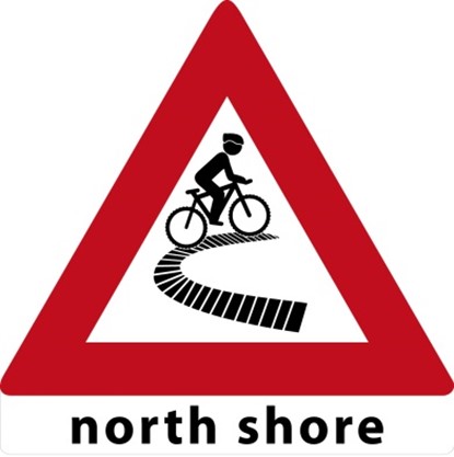 Dit bord waarschuwt je voor een houten element (zogenaamde north shore) die, als je daar niet op bedacht bent, risico op kan leveren.