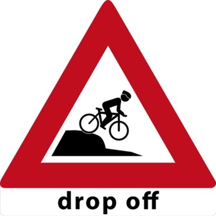 Dit bord waarschuwt mountainbikers voor een drop-off. Een drop is een verlaging waar je niet vanaf kunt fietsen. Je komt hierbij los van de grond. Ook hier geldt: alleen fietsen wanneer je voldoende techniek hebt.