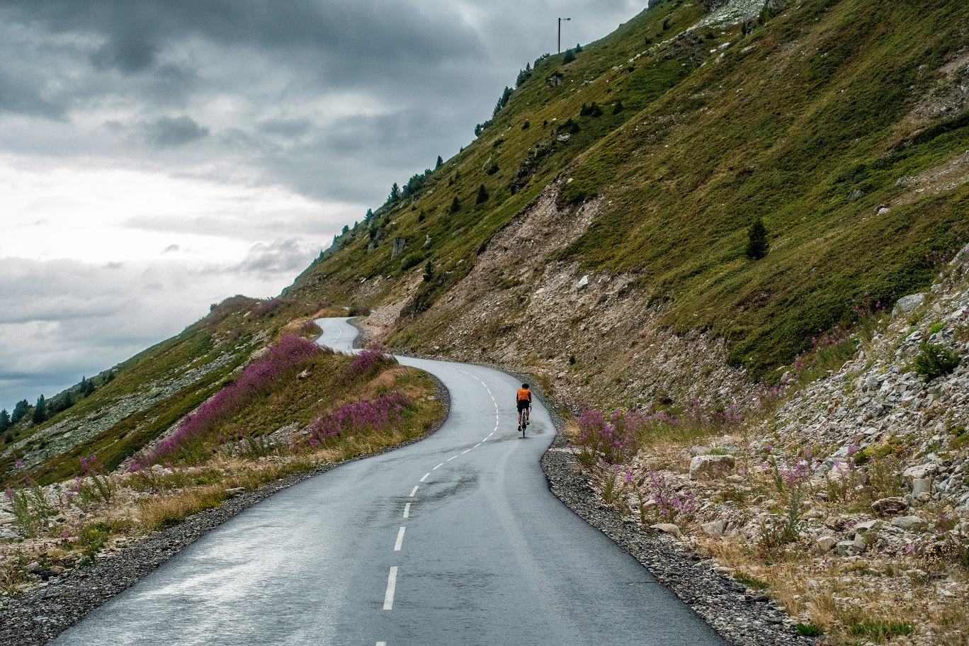 Het asfalt slingert als een zwarte skipiste steil omhoog. Ik leun naar voren om te voorkomen dat mijn voorwiel loskomt van de grond. De tikkende regen en dreigende wolkenluchten zorgen voor een extra dramatisch effect. Ik kijk uit over grauwe alpenweides en de rotsformaties die de top van de col markeren. ‘Courage!’ roept een afdalende mountainbiker.