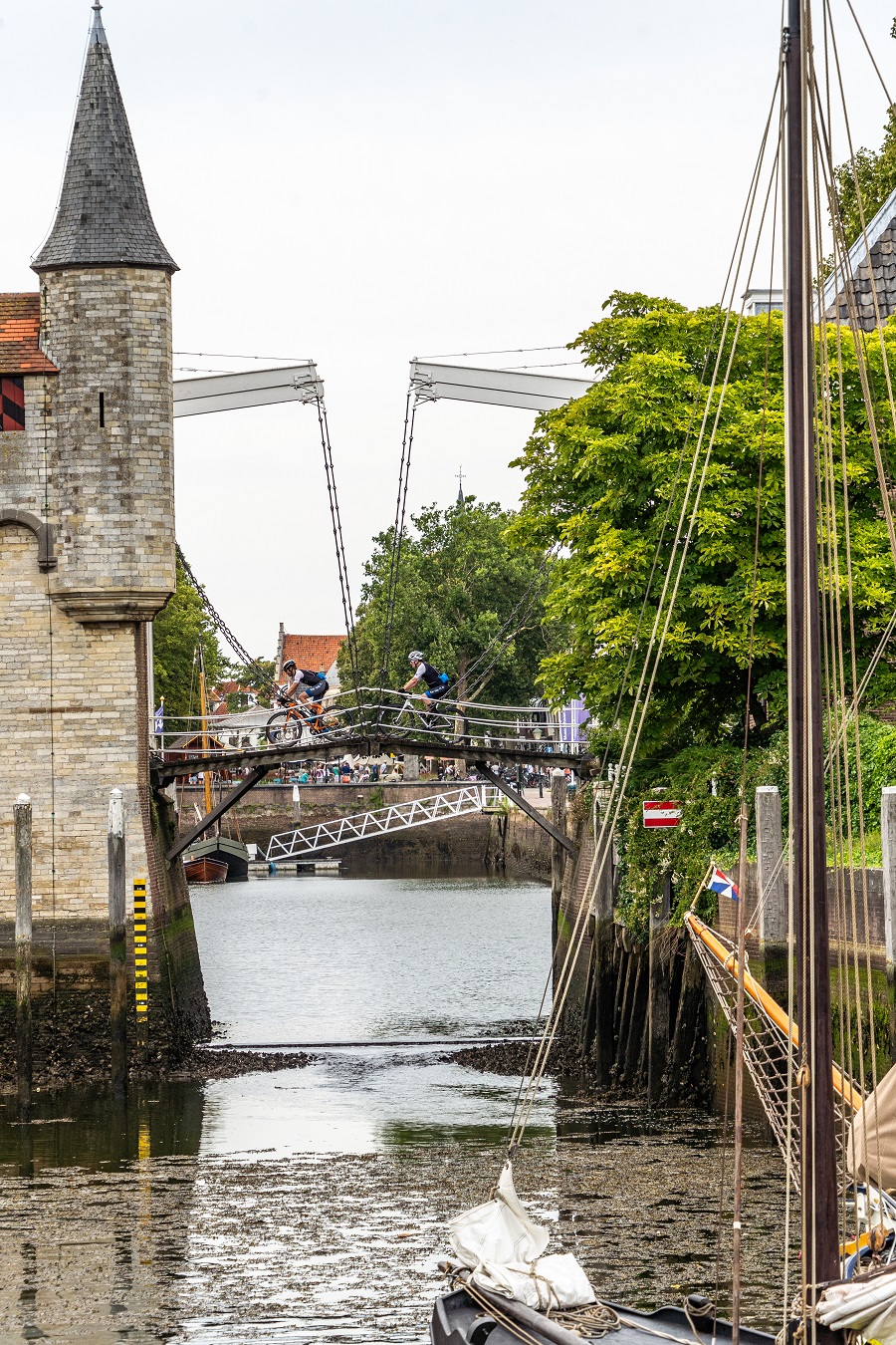 Ons spontane wedstrijdje op deze brug met een toevallige passant wordt helaas onderbroken doordat de brug minutenlang open moet staan om een aantal zeilboten te laten passeren. Tijdens de noodgedwongen pauze raken we in gesprek met de onbekende renner, die uit Vlissingen blijkt te komen. Hij heeft de Zeeuwse Wind Route al vaak gefietst.