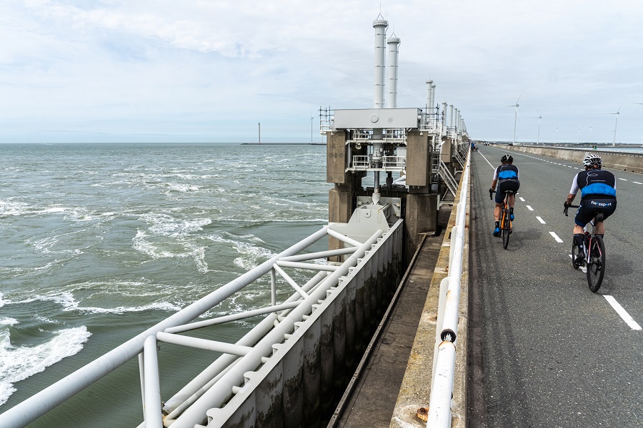 Vanaf Vrouwenpolder en bij de Banjaard draaien we de machtige Oosterscheldekering op, het grootste en beroemdste bouwwerk van de Deltawerken. De negen kilometer lange stormvloedkering tussen Noord-Beveland en Schouwen-Duiveland sluit bij dreigend hoogwater de Oosterschelde af. We hebben hier al eens eerder gefietst, maar het blijft indrukwekkend. Wind vol mee, zwaar tegen of zoals vandaag van de zijkant; het zorgt iedere keer weer voor een grote glimlach.