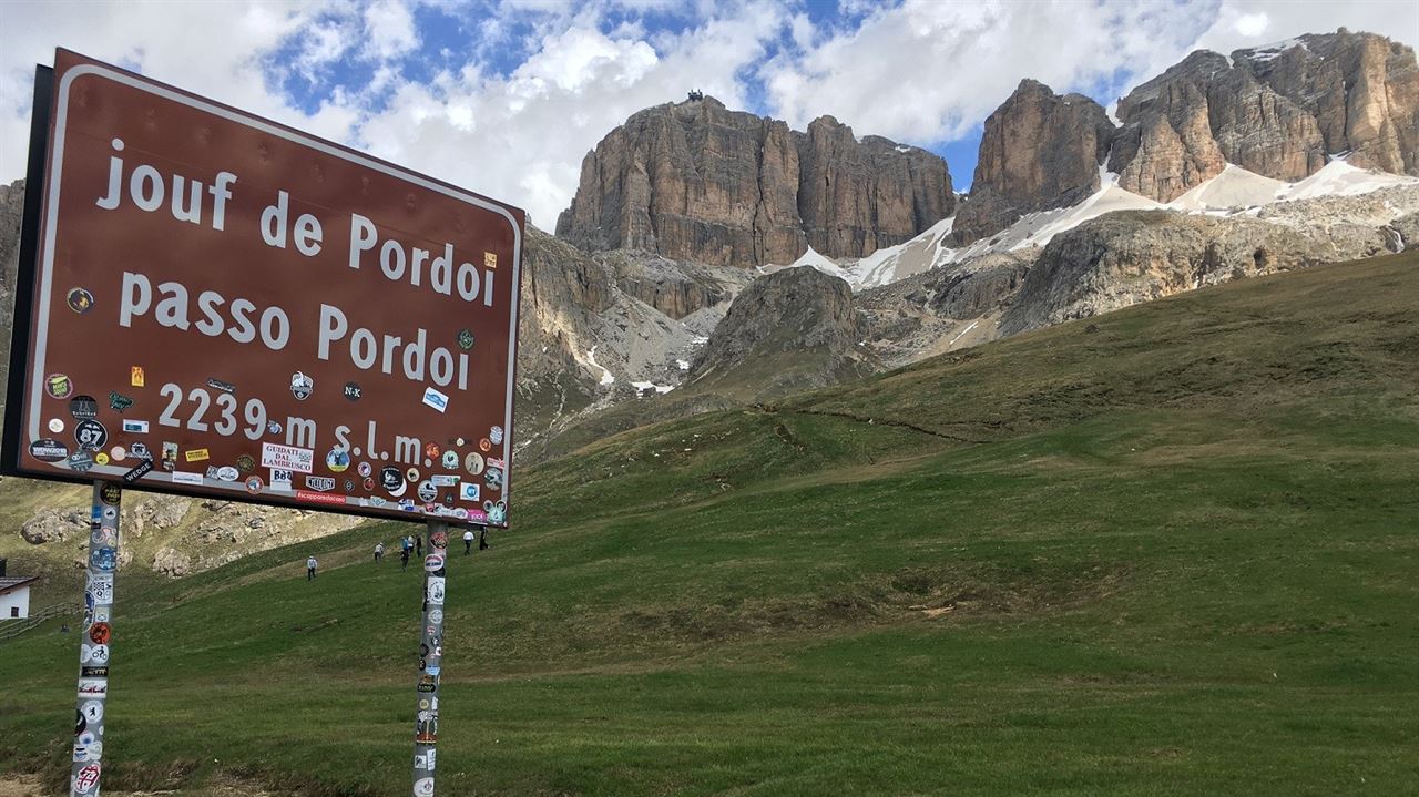 In Corvara gaat het officieel van start. De Campolongo is een mooie loper met fraaie haarspeldbochten. In de snelle afdaling naar Arabba geniet ik nog even van het afgezette parcours. In het wintersportoord neem ik afscheid van mijn gezelschap dat voor de klassieke route kiest. Ik fiets samen met Marco de Pordoi op naar een hoogte van 2239m. De 33 haarspeldbochten slingeren je gelijkmatig omhoog tegen 7,1% gemiddeld. Waar je ook kijkt, het lijkt alsof de karakteristieke steile pieken van de Dolomieten tot leven komen.