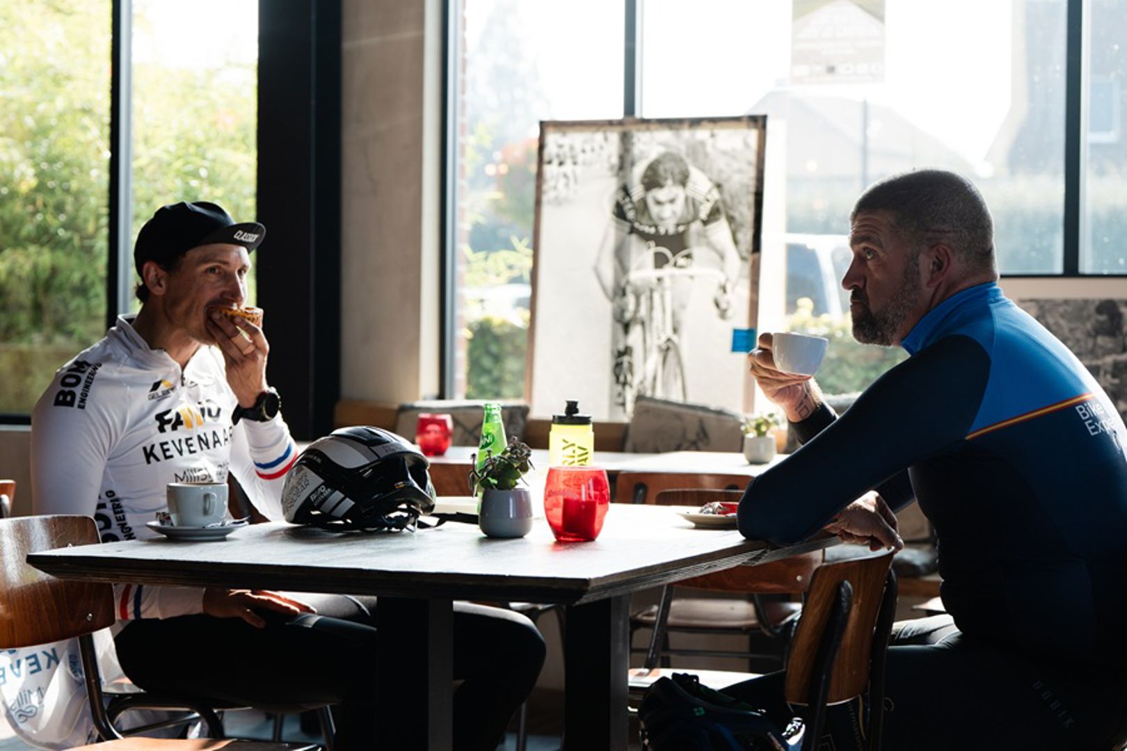 Langs de oude stroopfabriek, waar vroeger het zwarte goud van de regio werd ingekookt, volgen we de voormalige spoorlijn richting Kerniel. Net voor de tank op reserve springt, draaien we het terras van Café Coureur op. Binnen ademt alles koers; de collectie shirts aan de muren vormt de perfecte achtergrond voor de broodnodige ravitaillering. Met de cafeïne en suikers als verse munitie maken we ons klaar een gepeperde finale.