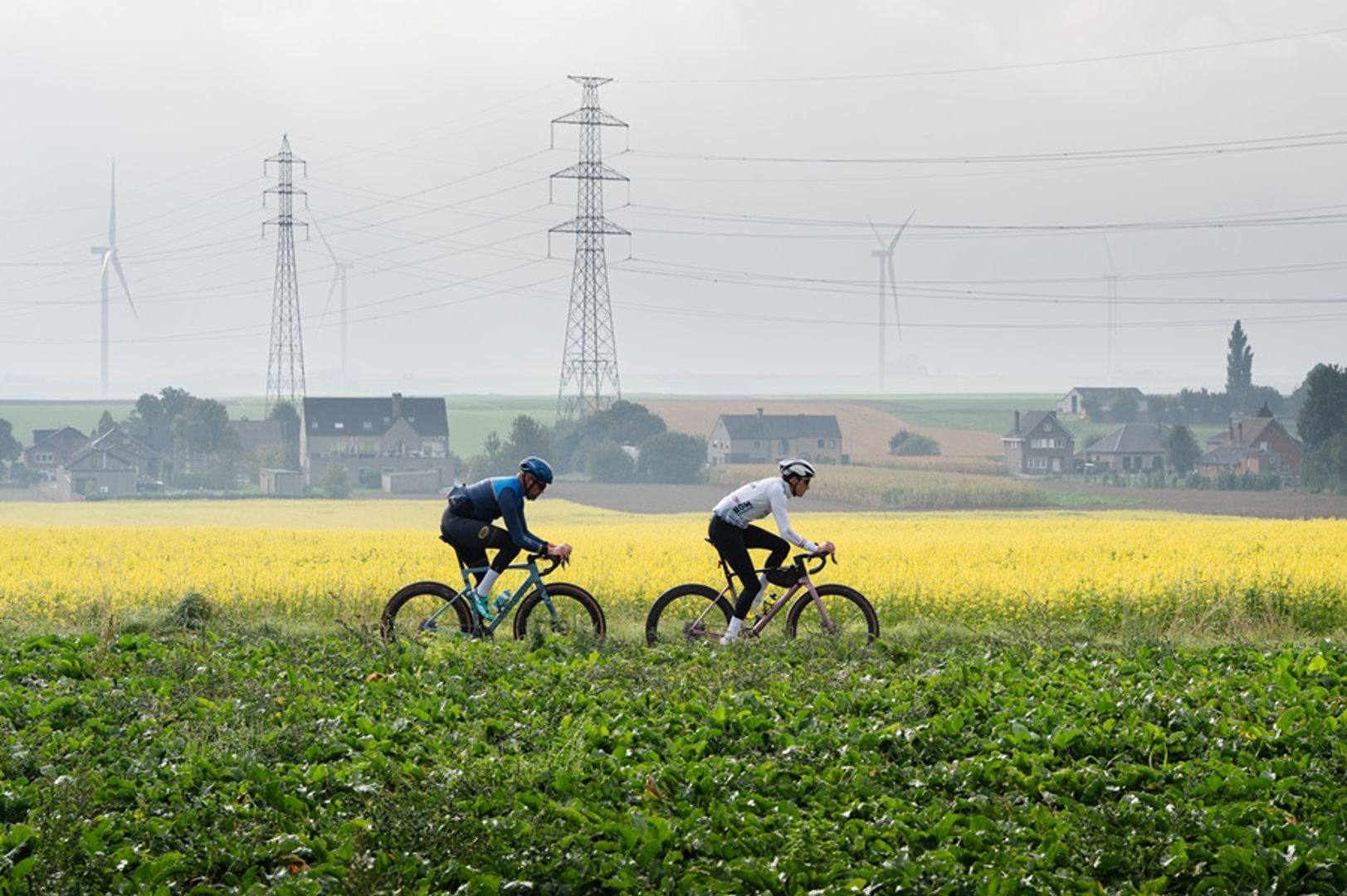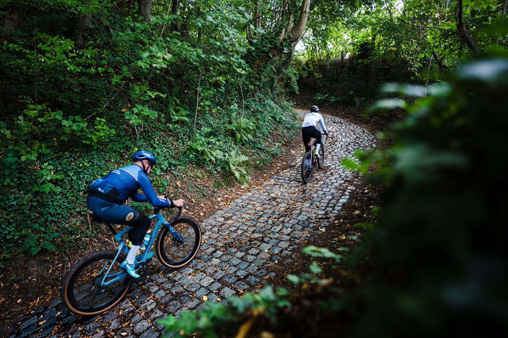 We doorkruisen een aantal verstilde dorpjes waar karakteristieke hoeves het decor vormen, om vervolgens koers te zetten naar de kasseistrook van Heks, scherprechter tijdens het EK 2024. Het recept: dokkeren en de ketting strak houden. De strook begint bedrieglijk vlak, maar na een haakse bocht gaat het bergop. In de afzink die volgt is het een kwestie van je stuur fixeren; de kasseien liggen er best goed bij, maar zijn nukkig genoeg om je het gevoel te geven dat je vullingen eruit trillen.
