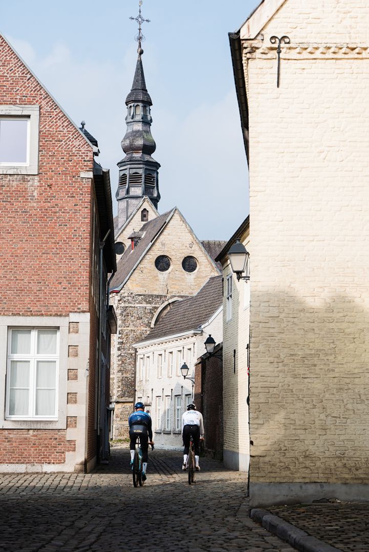 Zodra de groep compleet is en we de eerste omwentelingen maken, laten we de bunker bij de brug achter ons. We steken de grens over en draaien Maastricht in. Lang hebben we niet hoeven wachten op de eerste hindernis: de Louwberg. Hij is kort maar krachtig en prikt direct behoorlijk in de koude benen. Bovenop heb je even dat uitzicht over de stad, maar zodra we de wijngaarden van de Apostelhoeve passeren, verdwijnt Maastricht alweer uit het zicht. In de verte lonkt het majestueuze Chateau Neercanne waar we Vlaanderen weer inrijden.